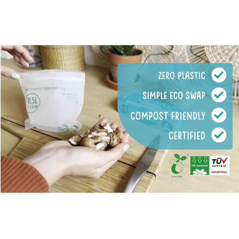 0.5 Litre (25 bags in total) Bag measures 15 x 15 cm Fridge and Freezer Safe! ?? Resealable bags are always useful to have around! Whether its for buttons, chopped up fruit and veg or for tidying away random cables in THAT messy drawer! Eco Green Living resealable bags are just like you know them- but compostable! Third party certified and 100% industrial compostable. The bags are also suitab...