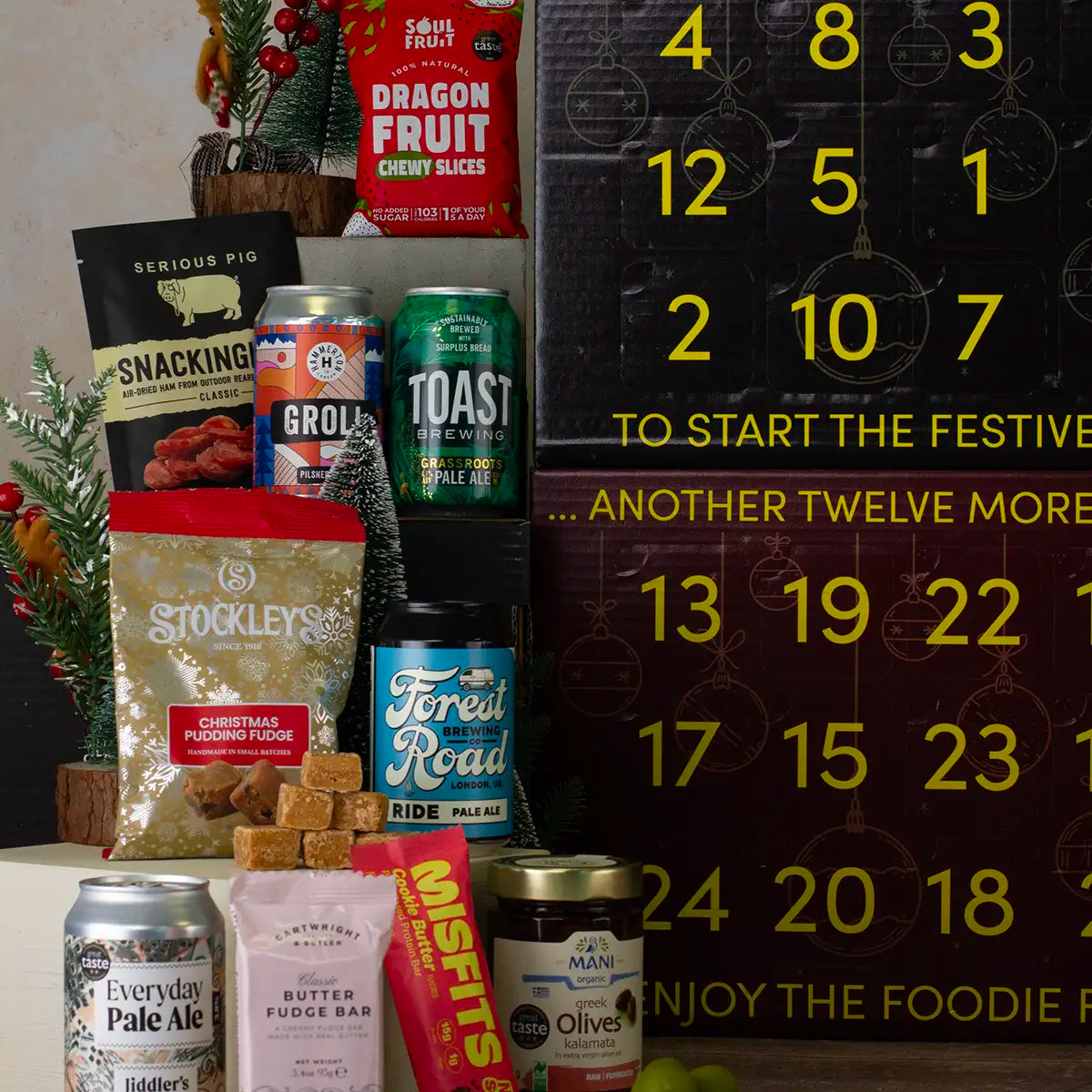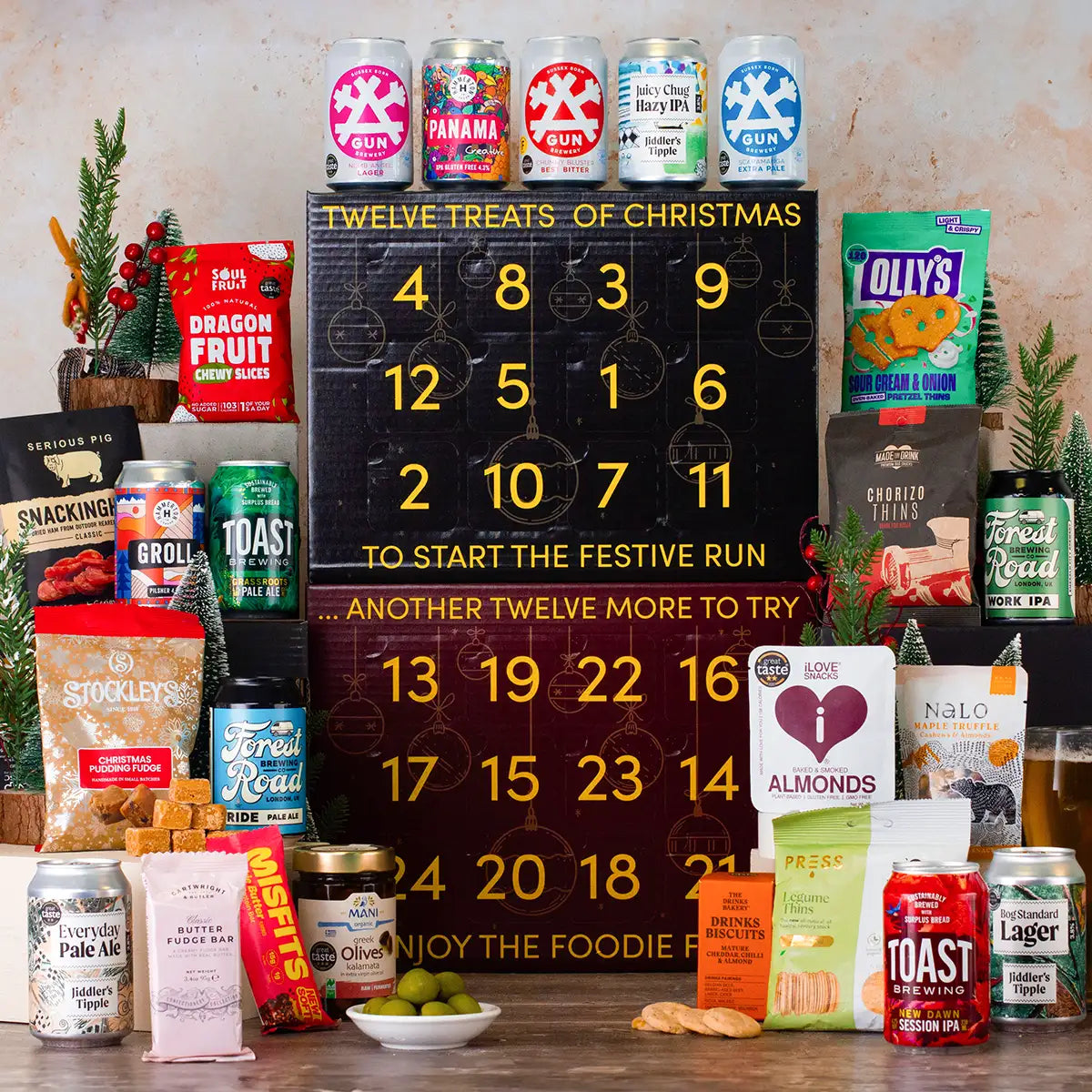 Our 24 Days of Beer and Snacks Advent Calendar is packaged beautifully in two FodaBox branded advent calendars, each with 12 windows (24 in total).