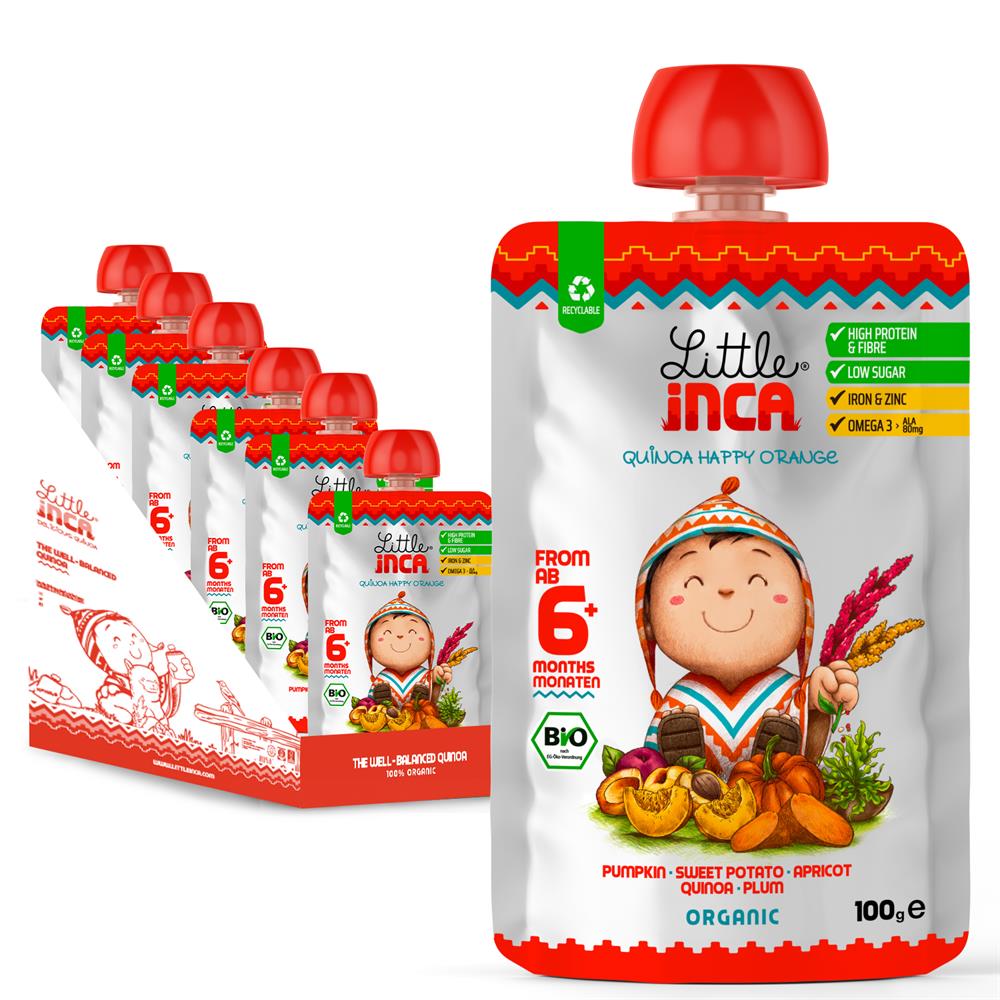 Our delicious Happy Orange contains all the key nutrients for growth. Contains nearly 64% vegetables, plus seeds providing excellence source of fibre for healthy tummies, protein for muscle growth and more nutrients. With high quinoa content, essential oils and minerals including Algae oil to provide Omega 3 for brain support and development.