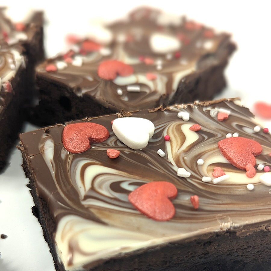 Each brownie is made with our delicious bakerdays brownie recipe and is topped with a thick chocolate buttercream and pink marbled icing hearts...ooohhhhhh... delicious and completely edible!