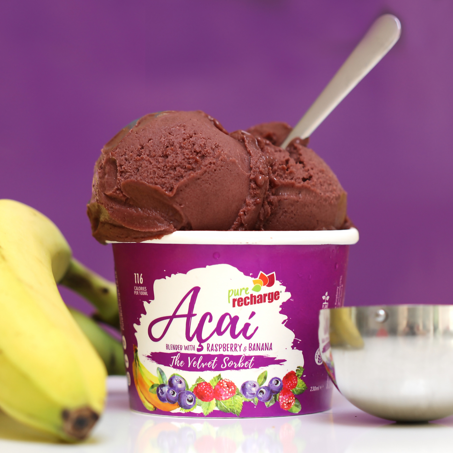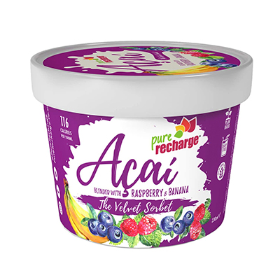 We have harnessed the power of the Brazilian acai berry, expertly blended it with banana, raspberry and a dash of apple juice to produce a ready to eat, velvety smooth sorbet.