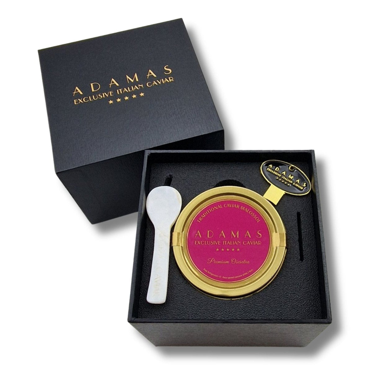 Indulge in the luxurious experience of our Adamas Premium Caviar Gift Set. This exquisite collection transforms the timeless elegance of caviar into a cherished gift, perfect for any special occasion or to simply show you care. Each set includes 50g of our finest Adamas Award-Winning Black Label caviar, renowned for its pure, delicate flavour and glossy dark sheen. Accompanied by a stunning mother of pearl spoon and a sleek caviar tin opener, this gift set exemplifies sophistication and premium quality. Whether you're new to the world of caviar or a seasoned connoisseur, the Adamas Premium Caviar Gift Set promises an unforgettable palate experience, harvested sustainably from the Acipenser Baerii sturgeon in Northern Italy using traditional malossol preservation techniques. The rich, creamy texture and lingering aromatic finish make every bite a celebration of gourmet excellence. Perfectly presented, this set is ready to impress, making it an ideal choice for birthdays, anniversaries, holidays, or as a distinguished addition to your own Caviar Gifts collection. Elevate your gifting with Adamas and delight your loved ones with a taste of true luxury.