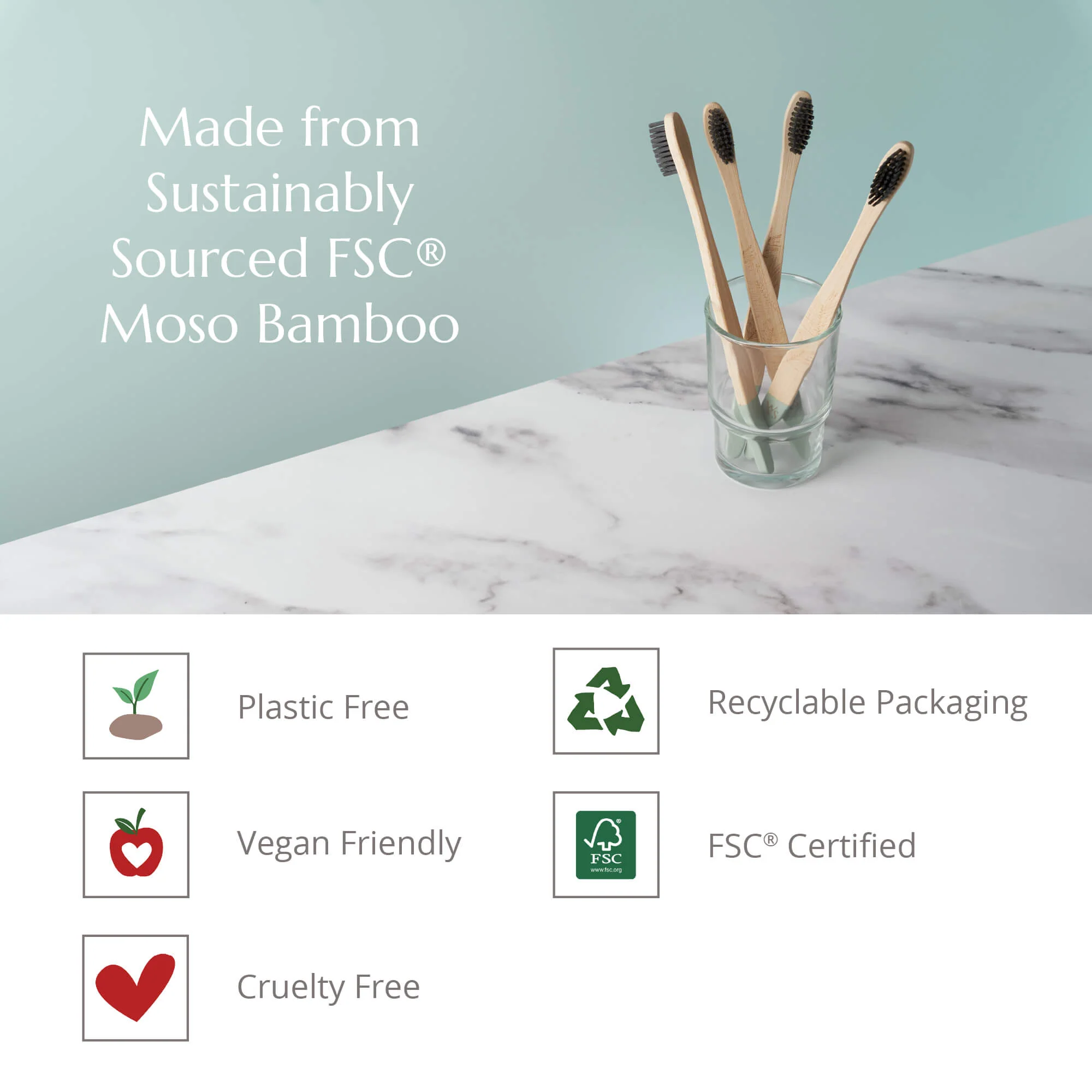 The bamboo used to make these toothbrushes is FSC® 100% certified. Bamboo is one of the fastest growing plants on earth, meaning there is a sustainable supply of bamboo - and it’s also completely biodegradable, meaning that it can be composted or recycled at the end of its life. The bristles used on our toothbrushes are also made from BPA free nylon - which is not only vegan, but is also more gentle on the teeth and gums than traditional plastic bristles.
