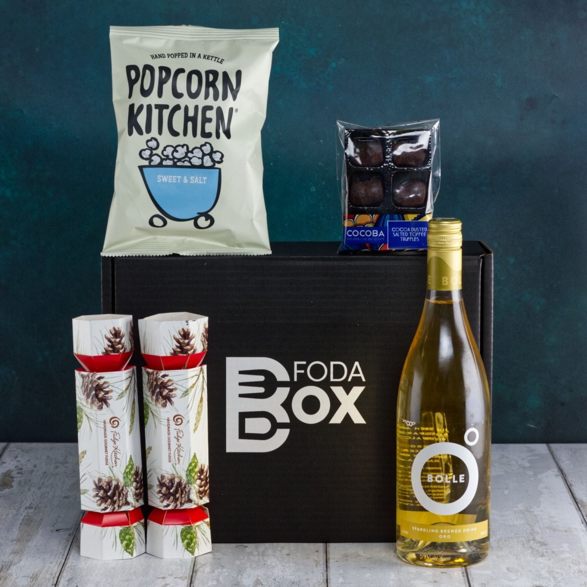 A bundle of sweet treats. Typically this includes brands and products such as Cocoba Truffles 54g, Popcorn Kitchen Popcorn 30g and 2 x Fudge Kitchen Christmas Fudge Crackers 65g.