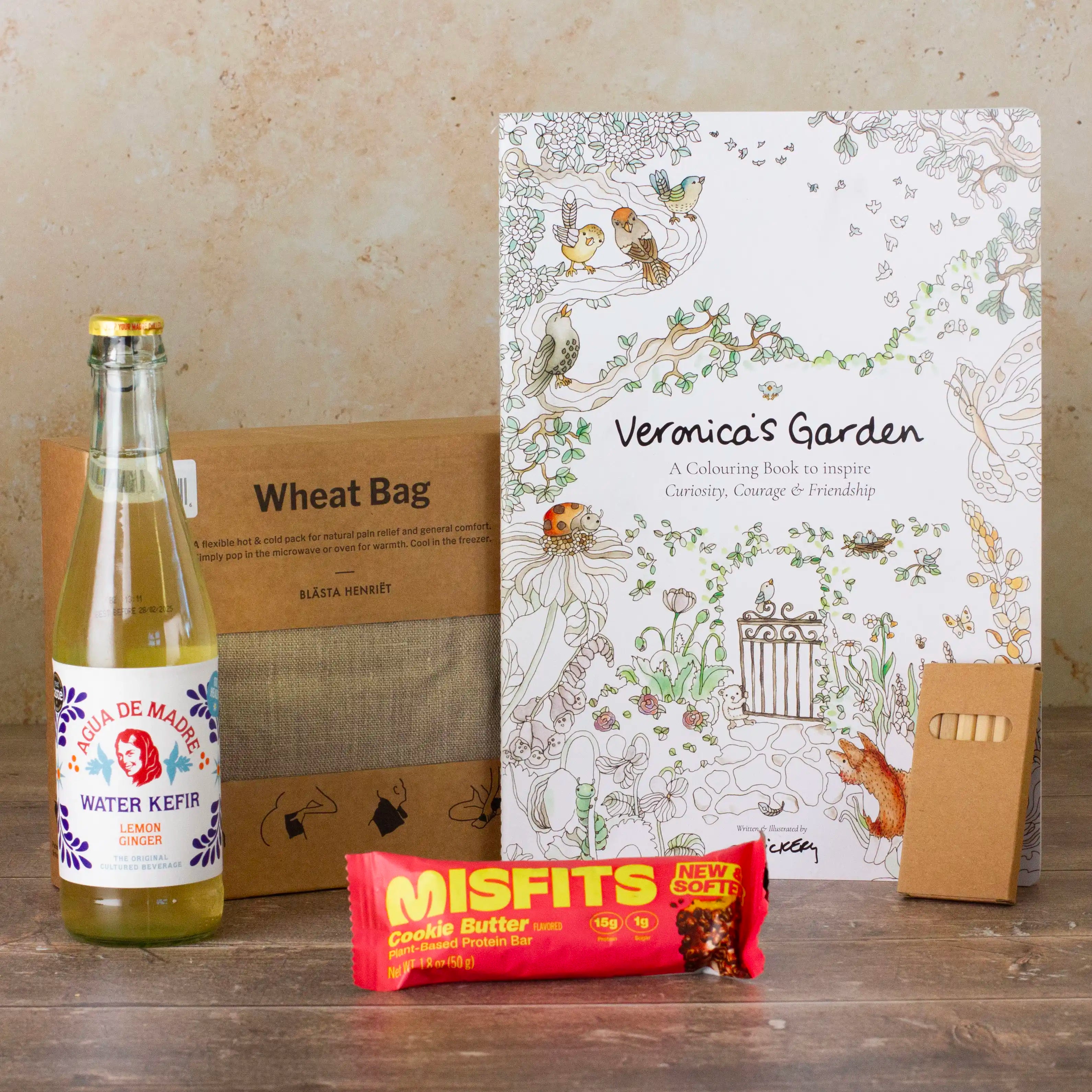 A gift to calm and promote mindfulness. A wheat bag that can be used hot or cold to sooth and relax the body, a beautiful colouring book to help relax and focus the mind, prebiotic soda supporting gut health and immunity, and a delicious snack bar too. (GF/V)