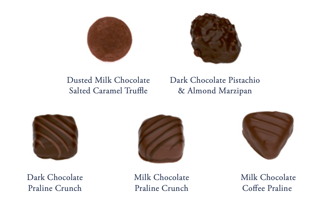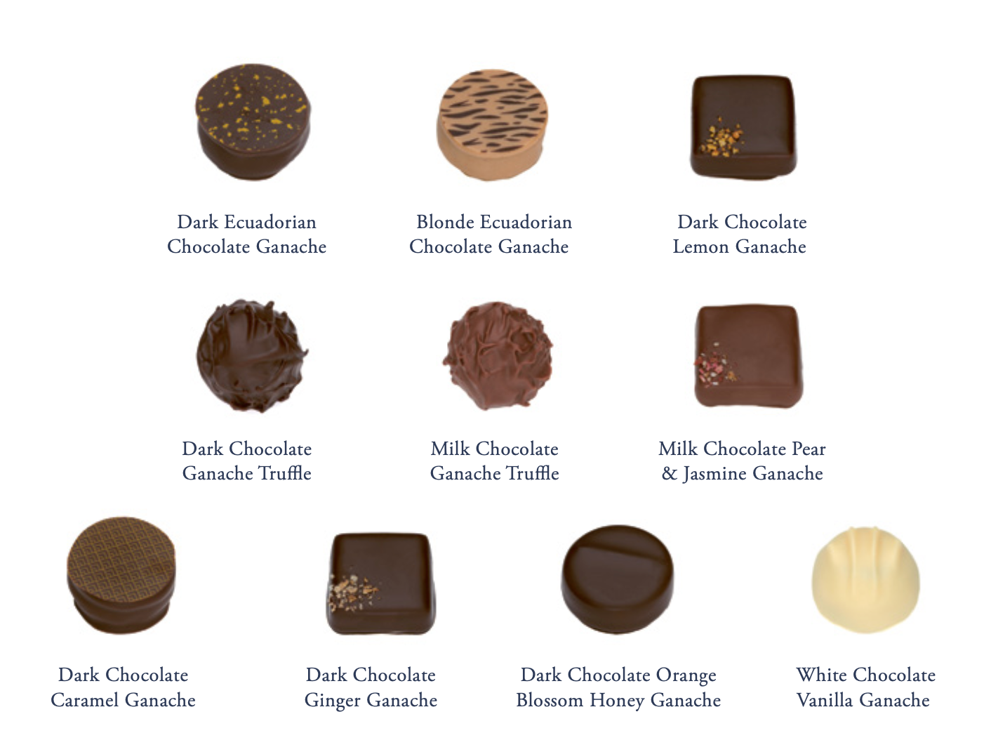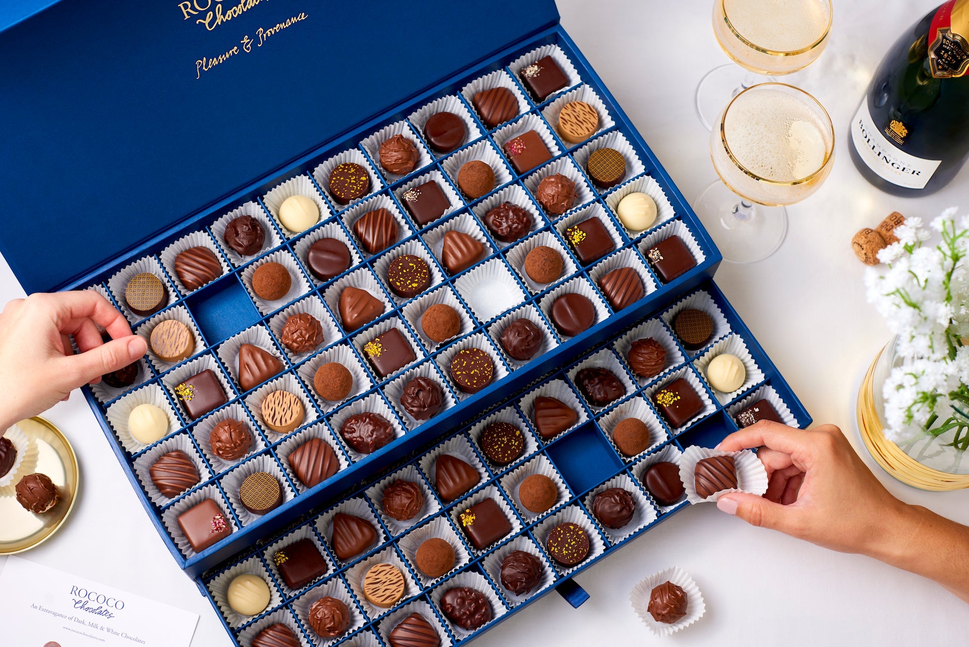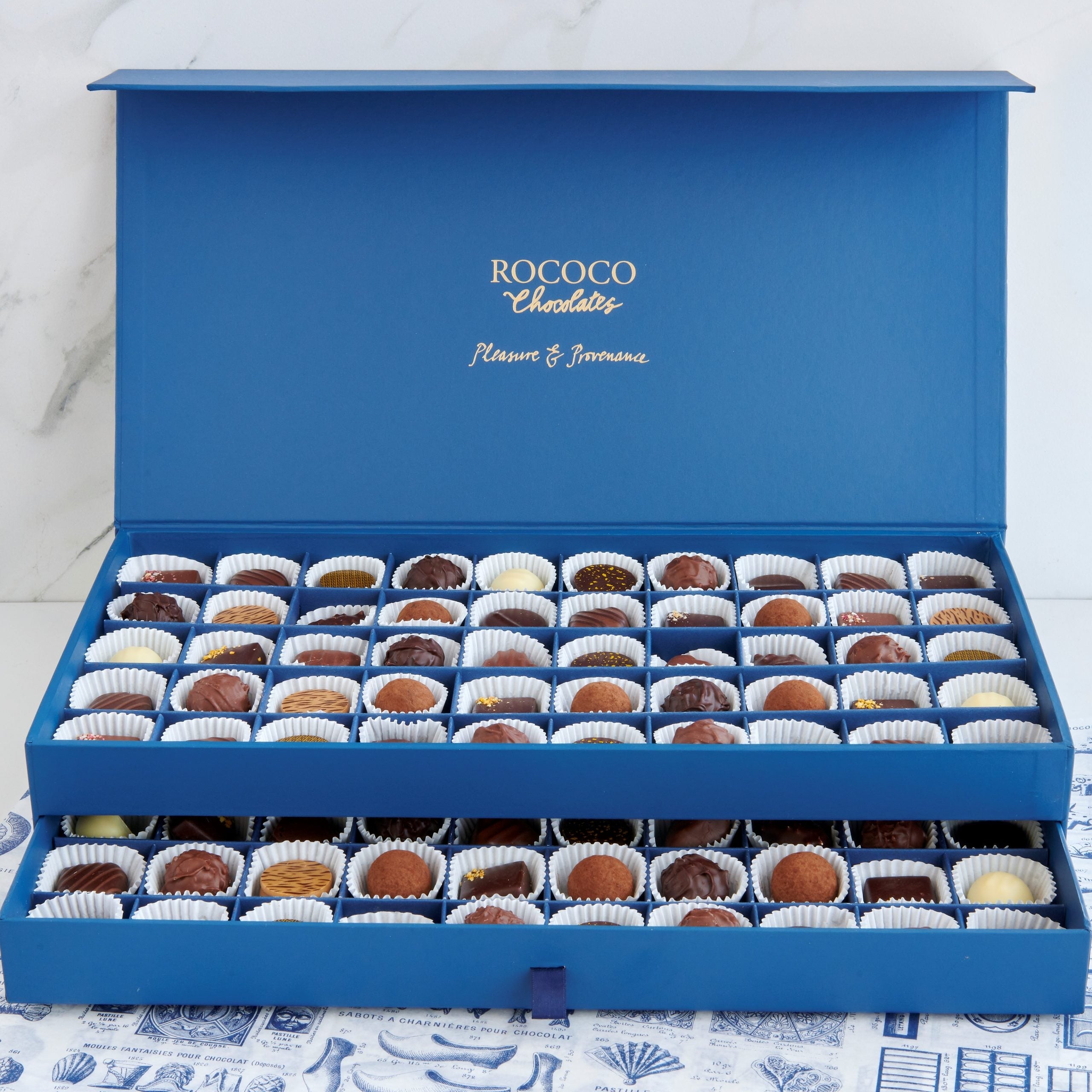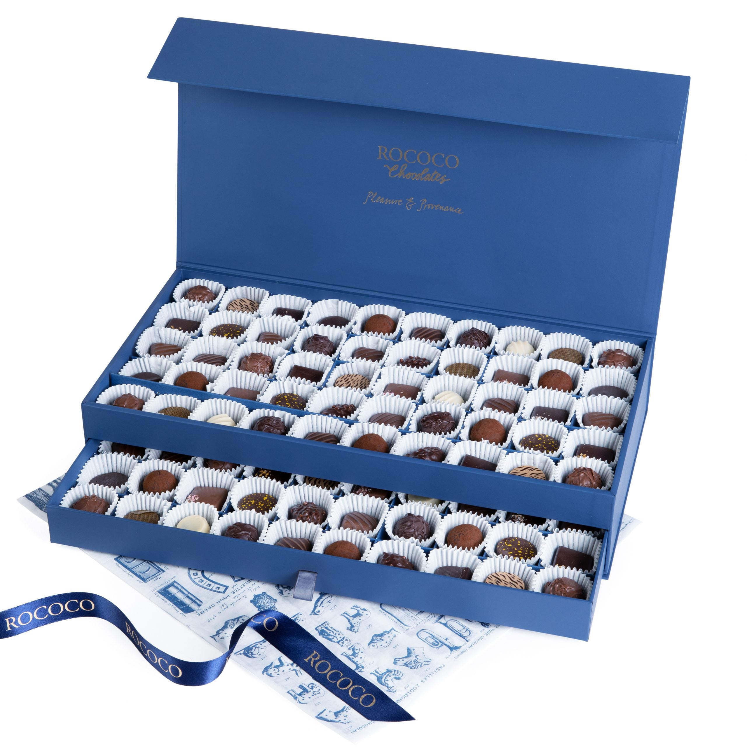 The ultimate chocolate gift – a 100-piece collection of velvety truffles, silky caramels, ganaches and pralines, beautifully presented in a Rococo gift box with pull-out drawers.