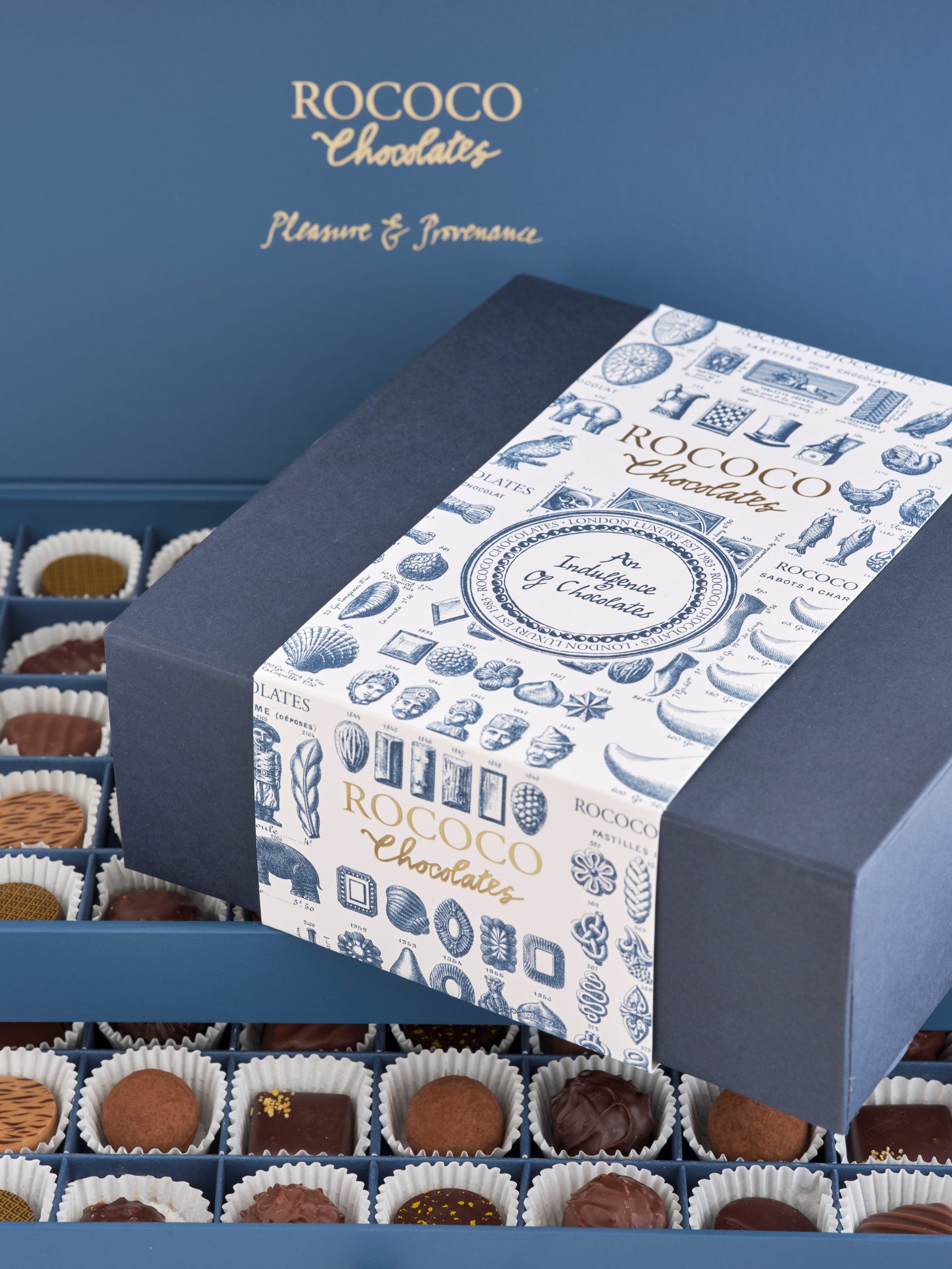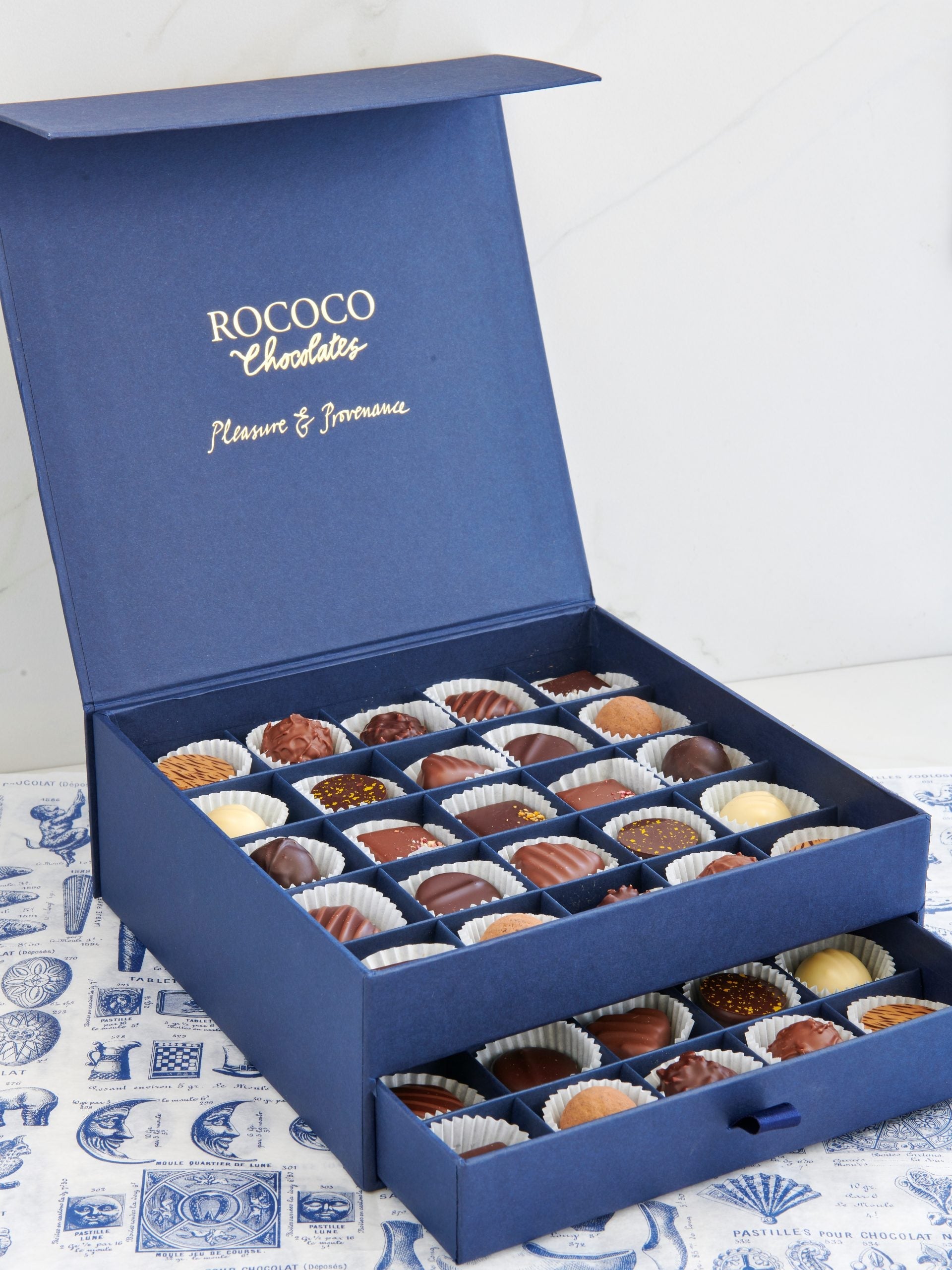 A superbly generous collection, this 50-piece selection of velvety truffles, silky caramels, ganaches and pralines, beautifully presented in a Rococo gift box with pull-out drawers.