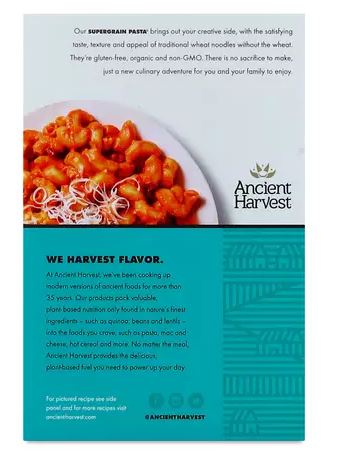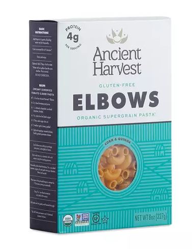 Dishes like gluten-free macaroni n’ cheese and pasta salad are all a cinch to make with Ancient Harvest Organic Quinoa Pasta Elbows. Since they’re made from organic corn and quinoa flour, these noodles are completely free of gluten and Celiac-friendly. And unlike most gluten-free alternatives, they have the same texture as real pasta. Ingredients Organic Corn Flour, Organic Quinoa Flour.