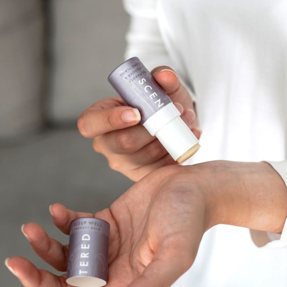 Sleep Well Balm Ingredients: Coco-caprylate/caprate, candelilla cera, shea butter, fragrance, carnauba cera, beeswax, moringa oil esters, tocopherol, sunflower seed oil, natural essential oils (*naturally occurring in essential oils).