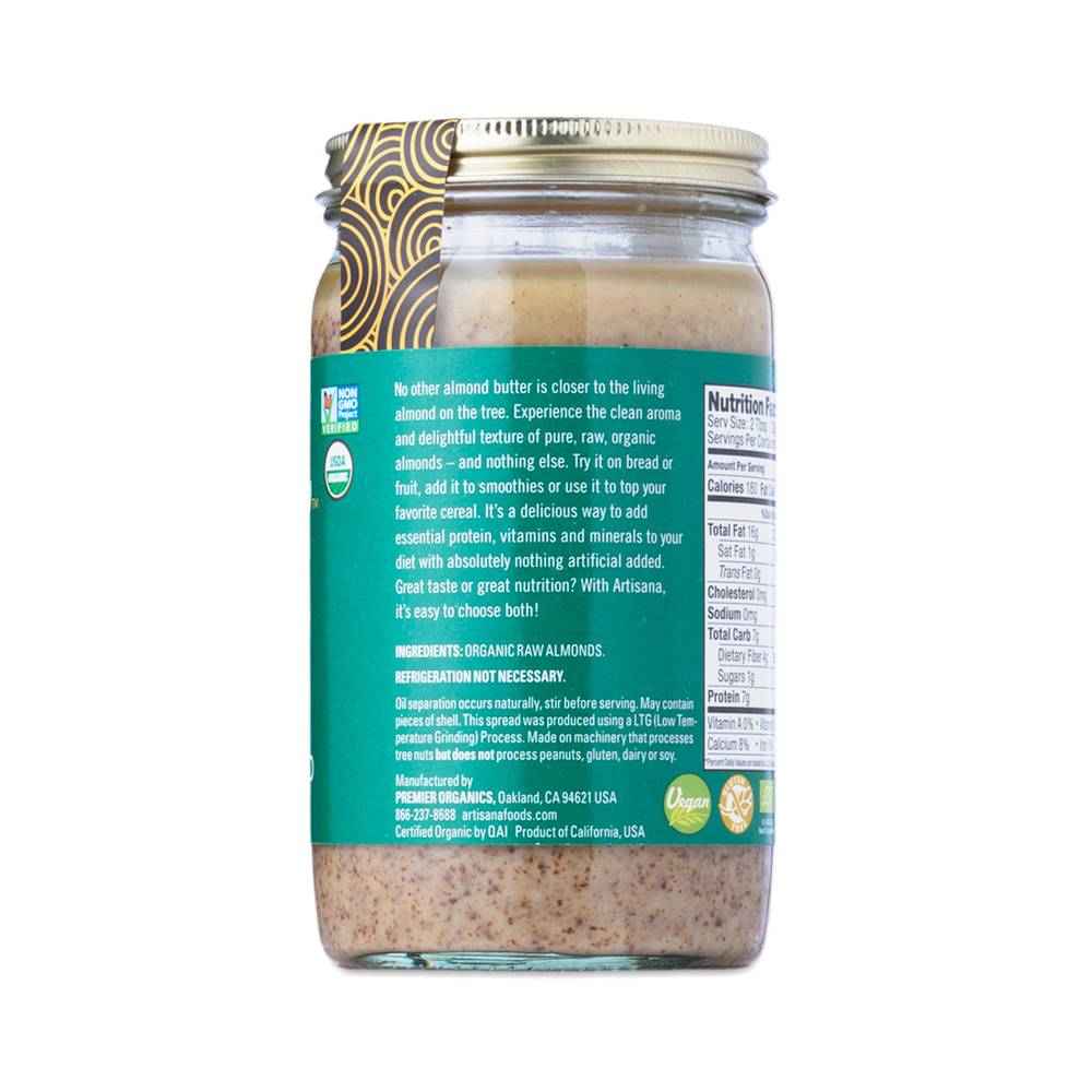 Rich and creamy Artisana Organic Raw Almond Butter is made from 100 percent organic nuts and crafted in small batches for the freshest quality. And without any artificial dyes, preservatives, or high fructose corn syrup, it packs in the nutritional profile of a superfood. A single serving provides seven grams of protein, keeping you feeling full. Ingredients Organic Raw Almonds (California).