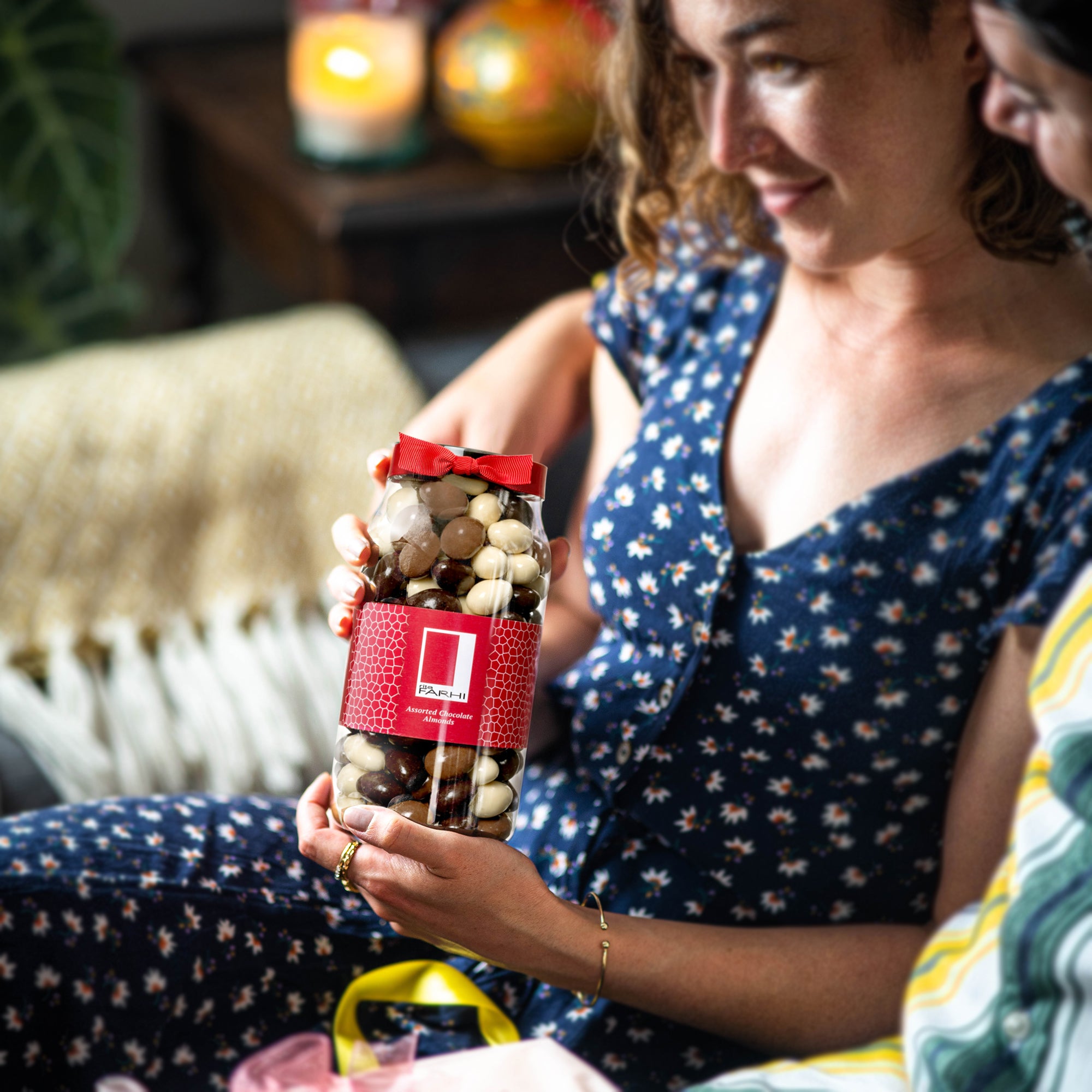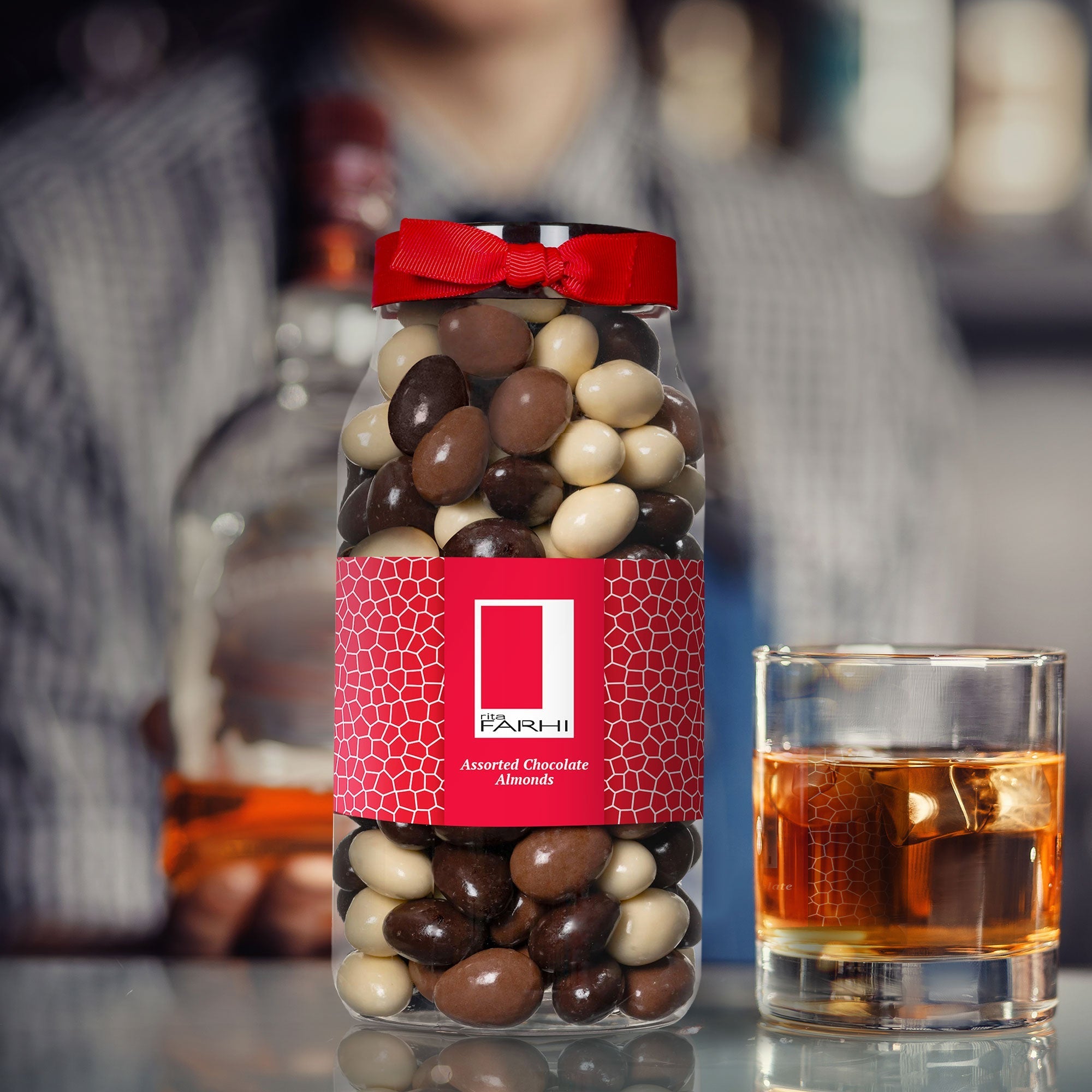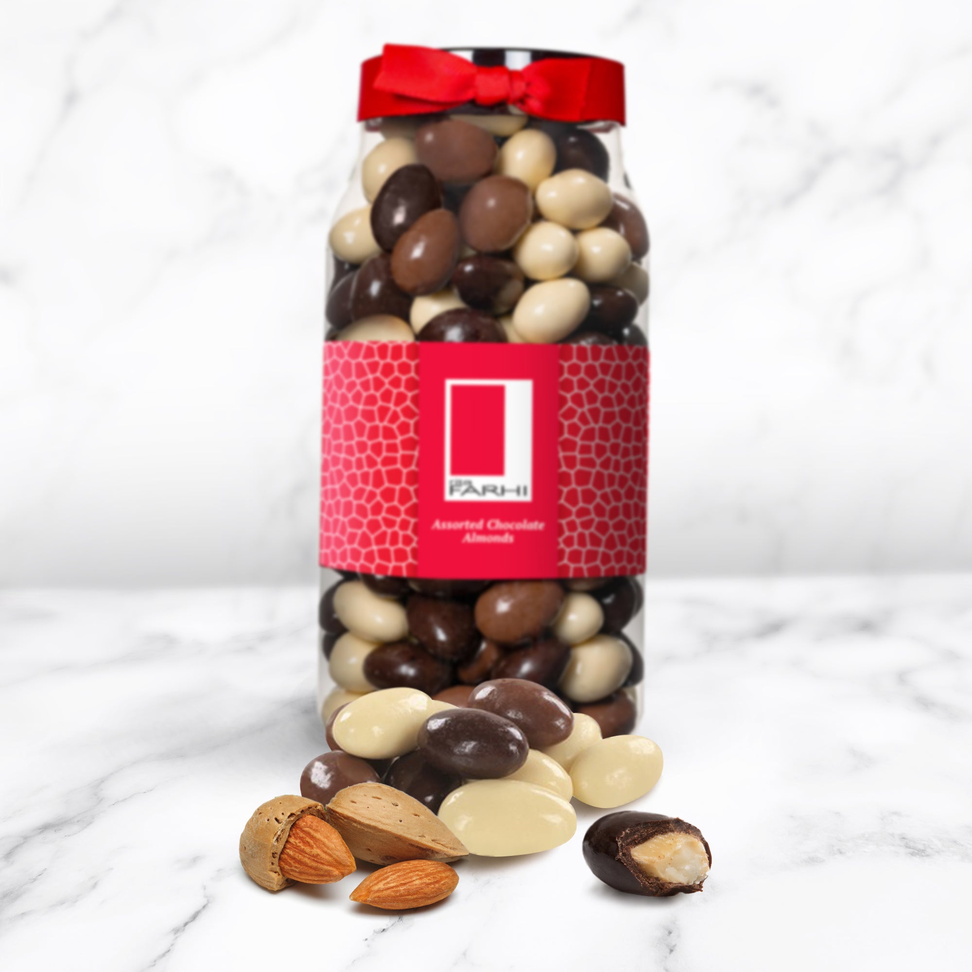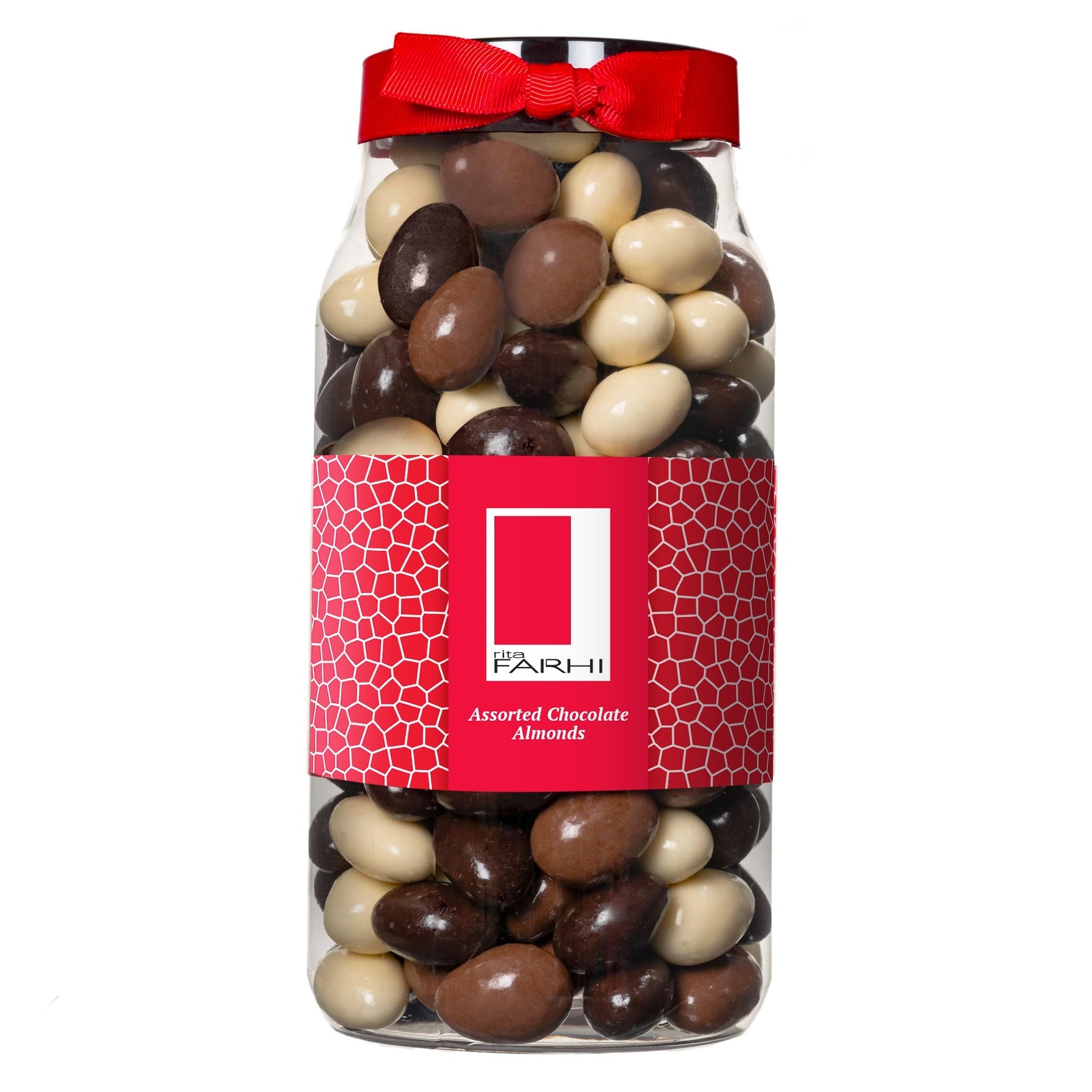 A decadent selection of milk, dark and white chocolate coated almonds, presented in our signature Farhi, ready to gift, gourmet confectionery jar.
