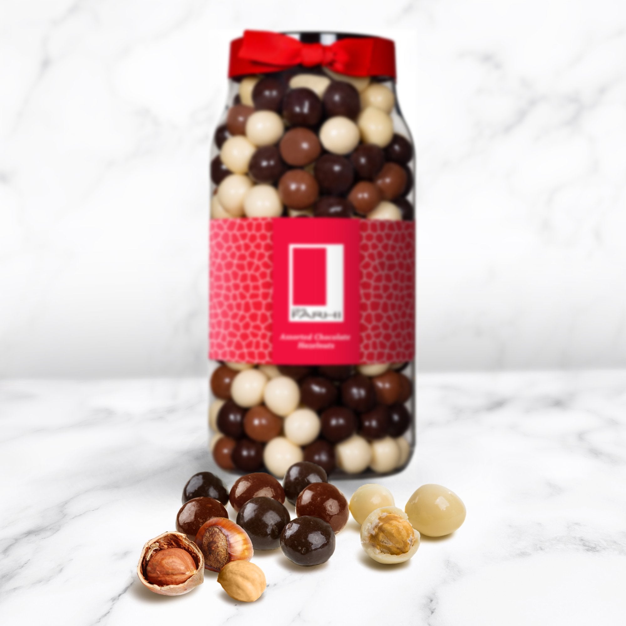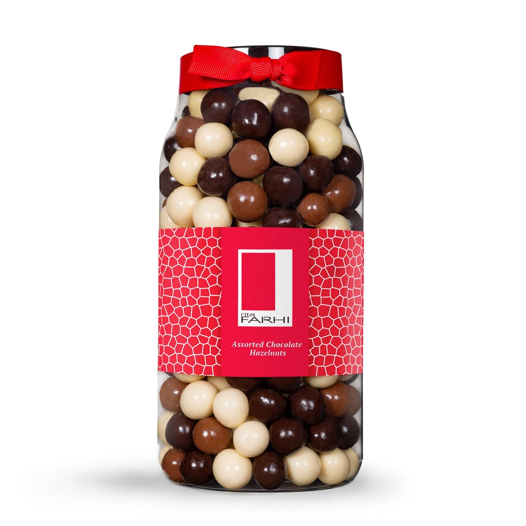 'Our signature style gourmet gift jar, filled with assorted chocolate hazelnuts'