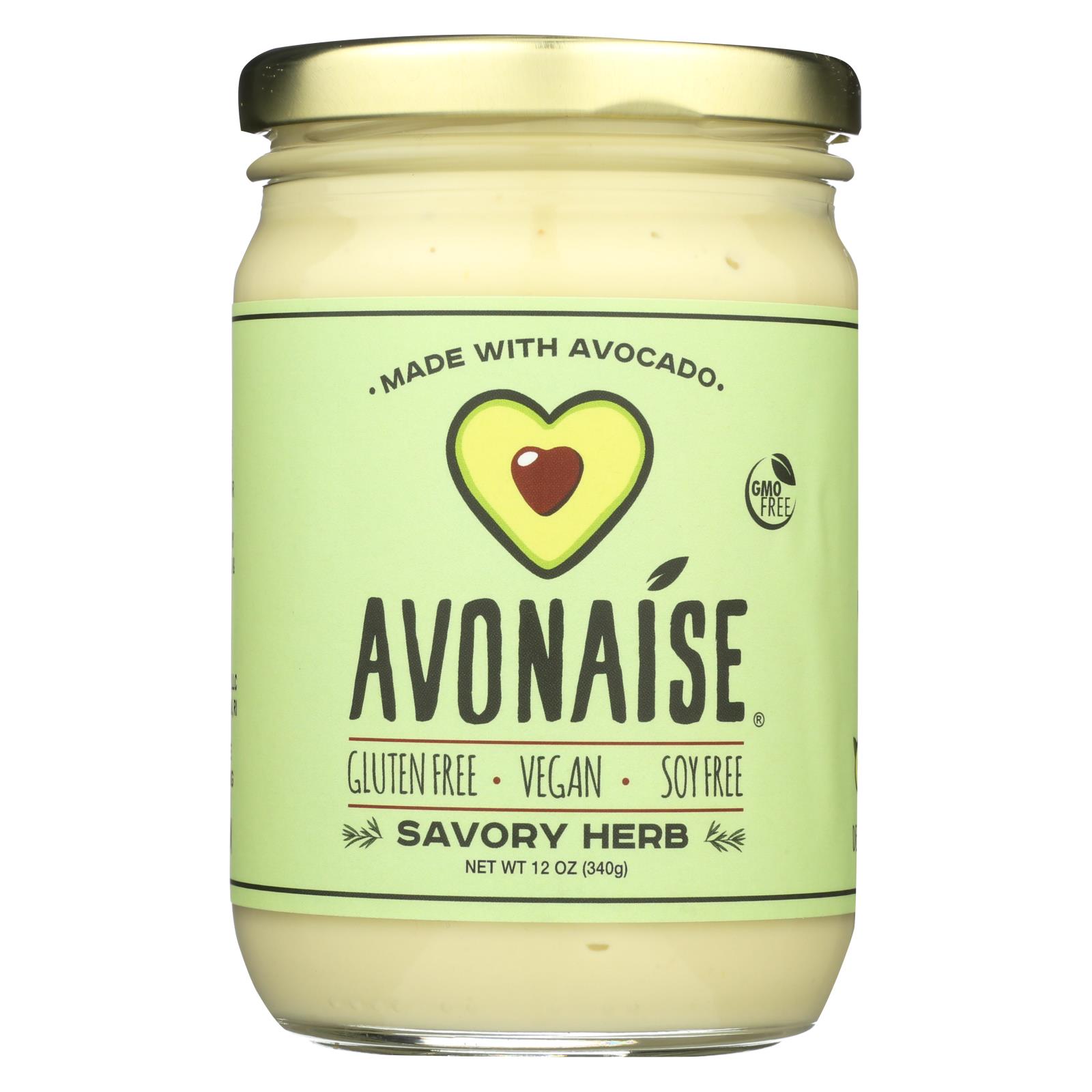 Avonaise savory herb mayonnaise substitute uses avocados instead of eggs to create a tasty alternative to mayonnaise. Use as a spread on sandwiches, or use it to make your favorite dressings and dips. In addition to avocado, the recipe includes olive oil, avocado oil, organic lemon juice, apple cider vinegar and water. A 12 oz jar contains about 22, 1 tbsp servings, with no cholesterol or trans f...