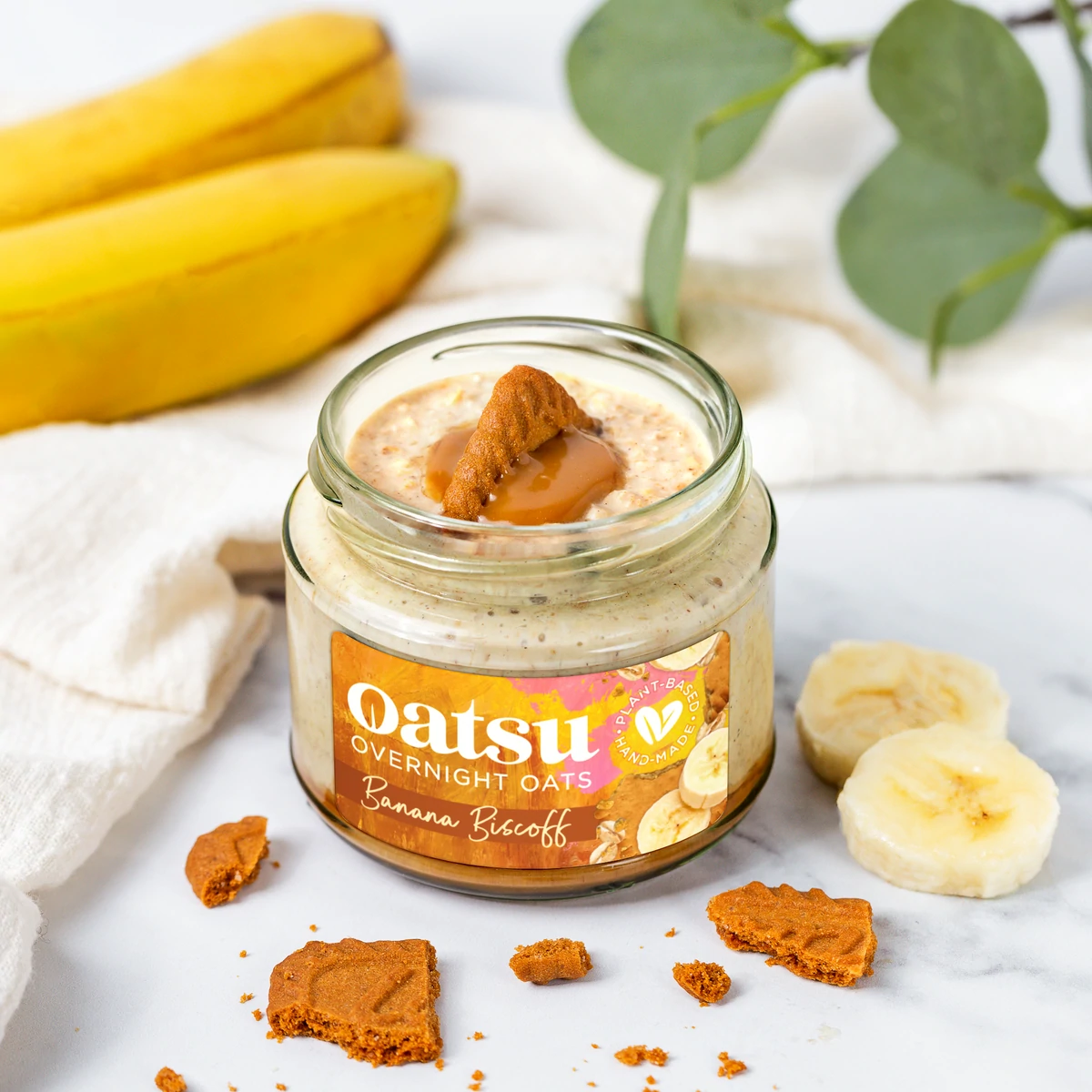 Creamy banana overnight oats sit on a sweet and salty biscoff base. Topped with more biscoff spread and real biscoff biscuit pieces. Please note - these overnight oats will be sent frozen. When ready to enjoy, defrost overnight in the fridge and use within 24 hours.