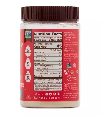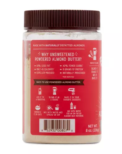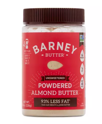 Go nuts for Unsweetened Powdered Almond Butter. Barney Butter’s unique formula is packed with protein and has less fat, calories, and carbs than traditional options because the oil is extracted from the almonds, leaving all the nutrients inside a dry powder form. Add water for a traditional spread or throw a scoop into your smoothie or baked goods. Ingredients Blanched almonds.