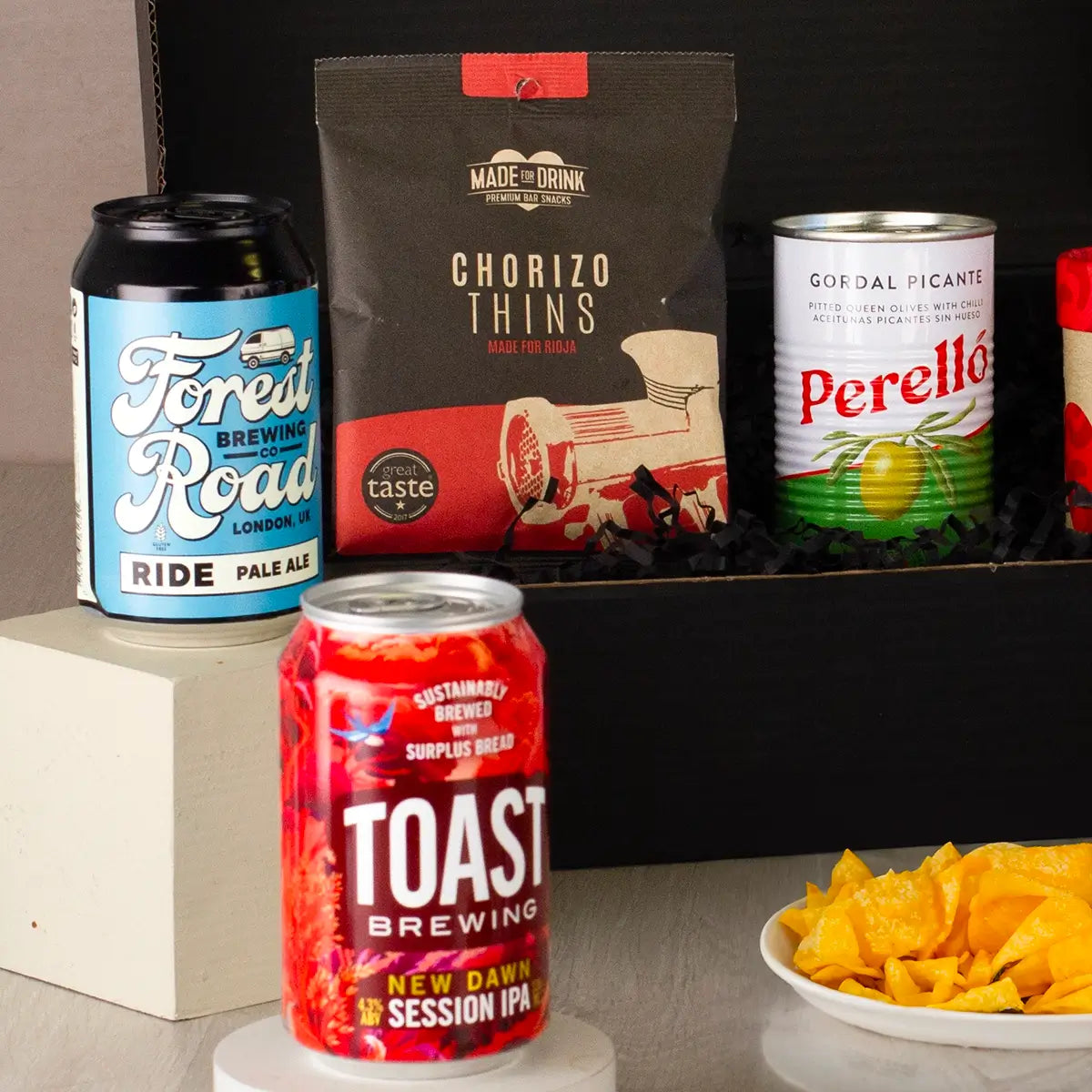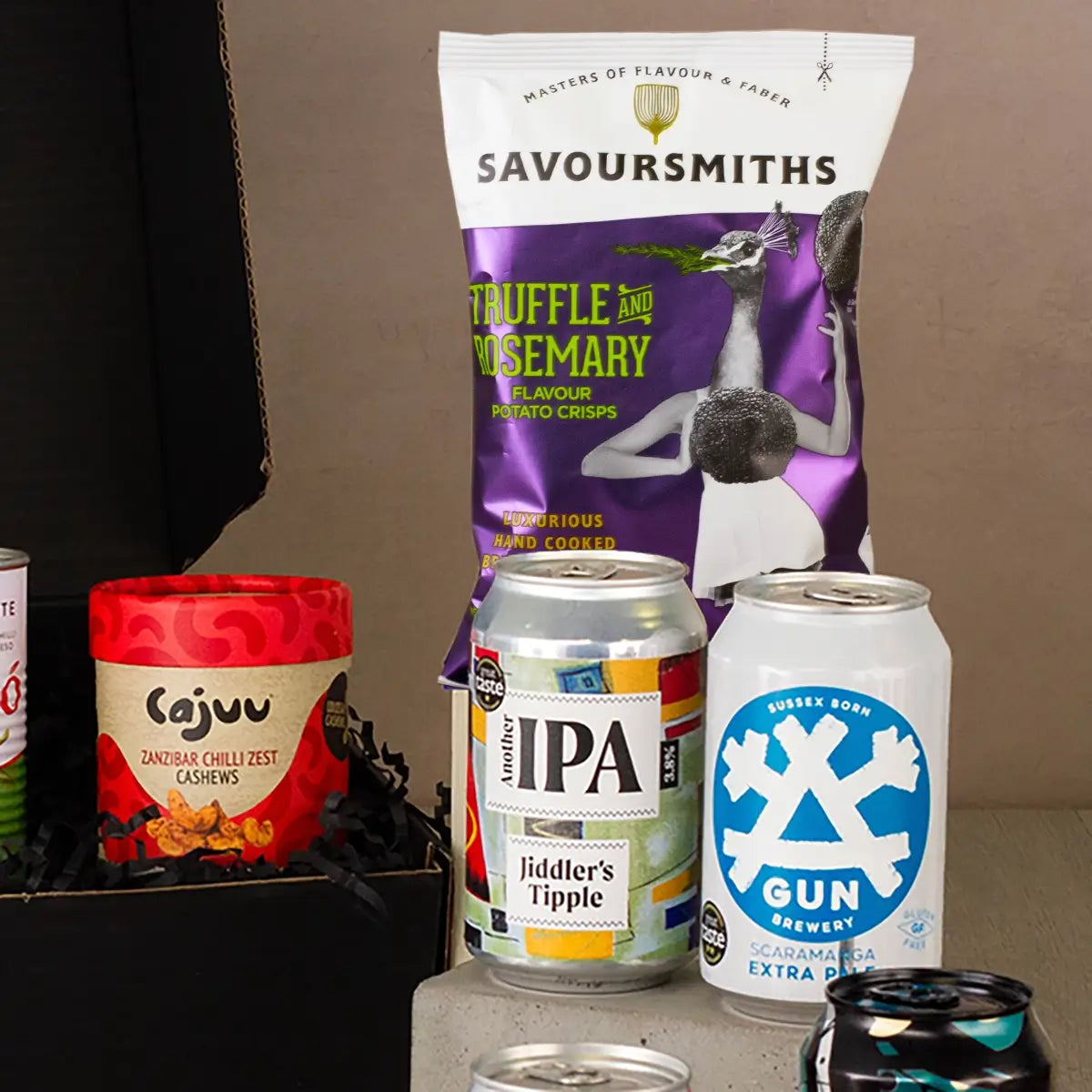 Elevate your at-home entertaining with our Beer and Nibbles Hamper, thoughtfully inspired by the vibrant world of tapas and pinchos. This exquisite hamper allows you or your loved ones to recreate the delightful experience of Spanish small plates, perfectly paired with a curated selection of craft beers. Each hamper features a diverse range of beers from independent UK producers, ensuring a unique and flavorful journey with every sip. Complementing the beverages are a variety of premium snacks, selected to enhance the tasting experience and satisfy every palate.