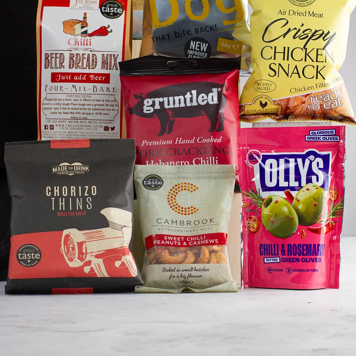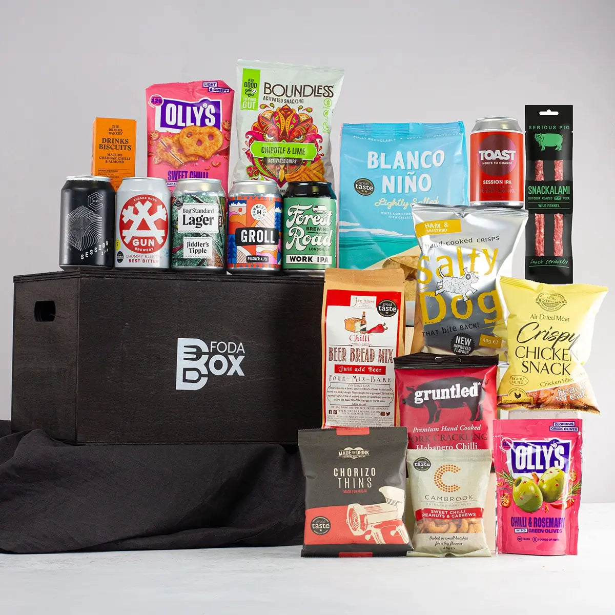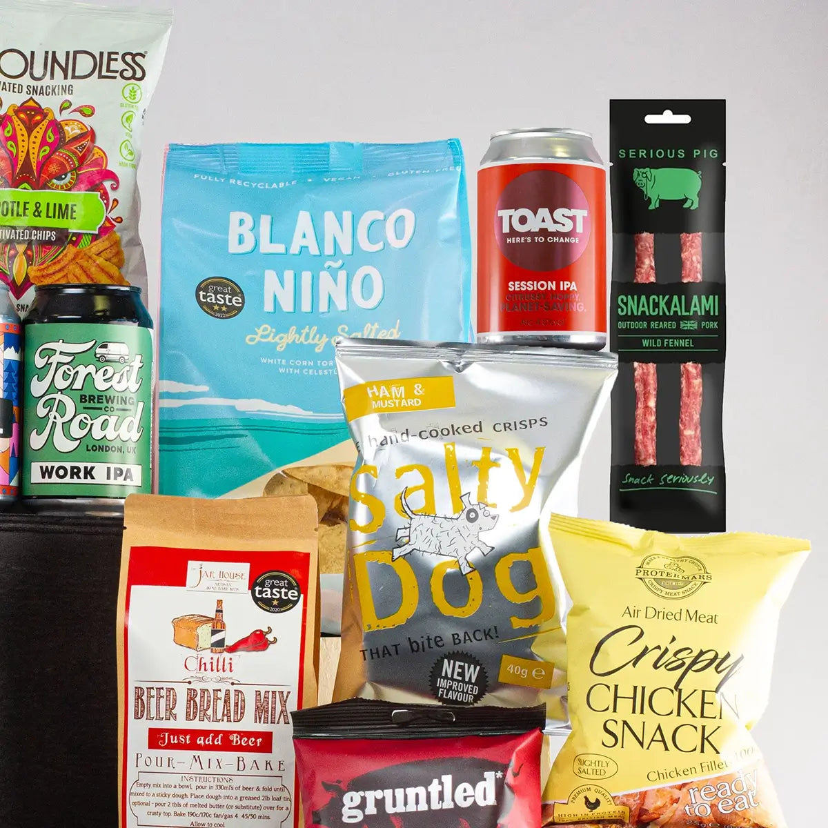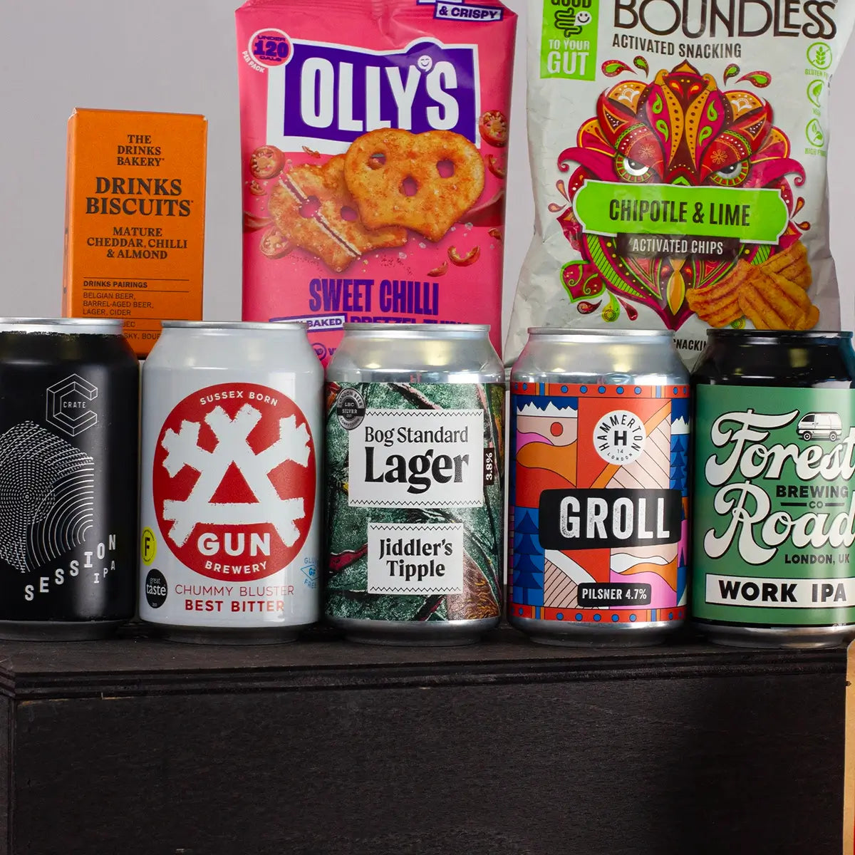 Celebrate Father's Day in style with our Big Beer and Snack Hamper, the ultimate pub snacks hamper designed to delight any dad who appreciates the perfect blend of craft beers and gourmet treats. Presented in a luxurious pine box, this generous hamper offers a curated selection of 12 artisan snacks and 6 premium craft beers, ensuring a memorable and flavoursome experience for your dad.