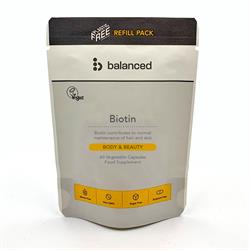 Balanced Biotin 60 Veggie Caps in our 100% recyclable paper refill pouch. Biotin contributes to normal maintenance of hair and skin. Vegan and free from excipients, soy, GMO, gluten, lactose and sugar. For nutritional information and ingredients, click Further Information.