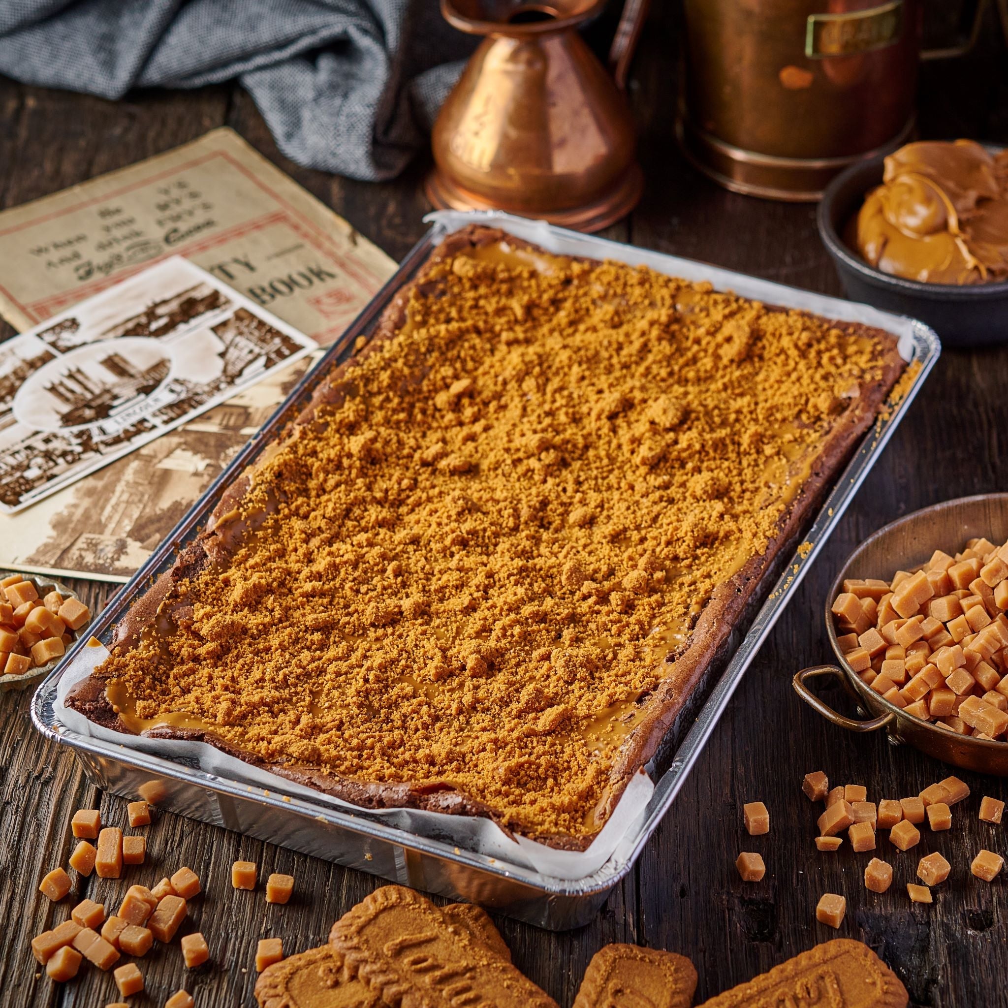 An indulgent slab of brownie made with Belgian chocolate covered in a layer of smooth Biscoff spread and finished with Biscoff crumb