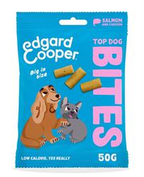"Our tasty, soft Top Dog Bites are ideal for learning new things together. Teach your furry sidekick to bring back their ball, drop your favourite slippers, or relax by your side. And expect wags in return. Tailored for smaller and bigger dogs, this grain free recipe is low in calories and bursting with fresh salmon and chicken. So you can keep these treats on tap. Can we hear a wow, woof, wag?"