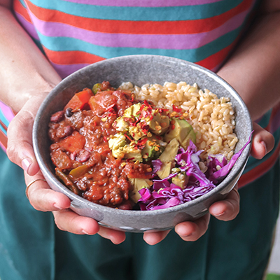 A hearty black bean chilli with sweet potato, lentils and peppers in our rich chilli sauce, served with brown rice. 350g.