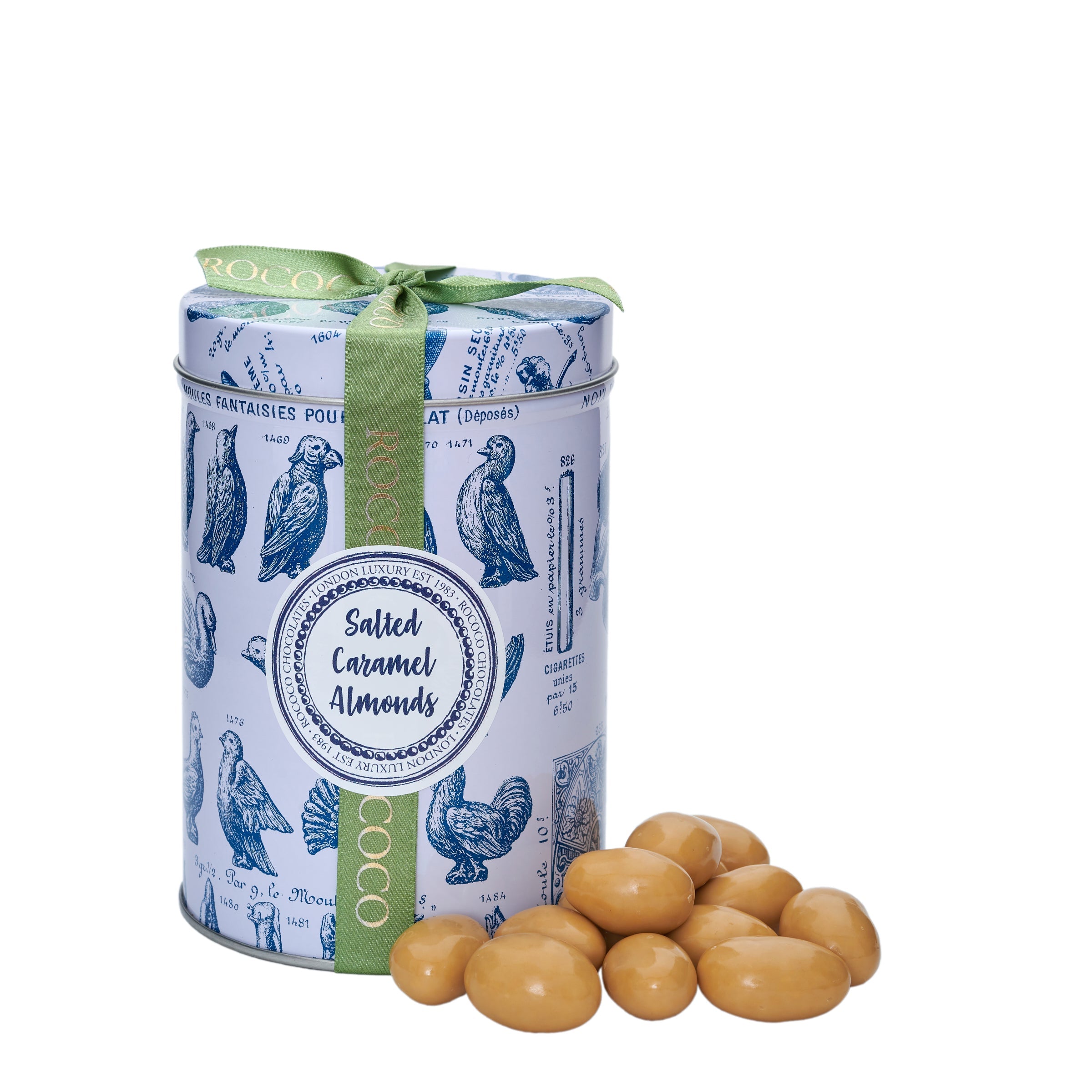 Roasted almonds encased in white chocolate with caramel, with a the warm and mellow flavour reminiscent of butterscotch. Presented in a Rococo print gift tin and hand tied with ribbon.