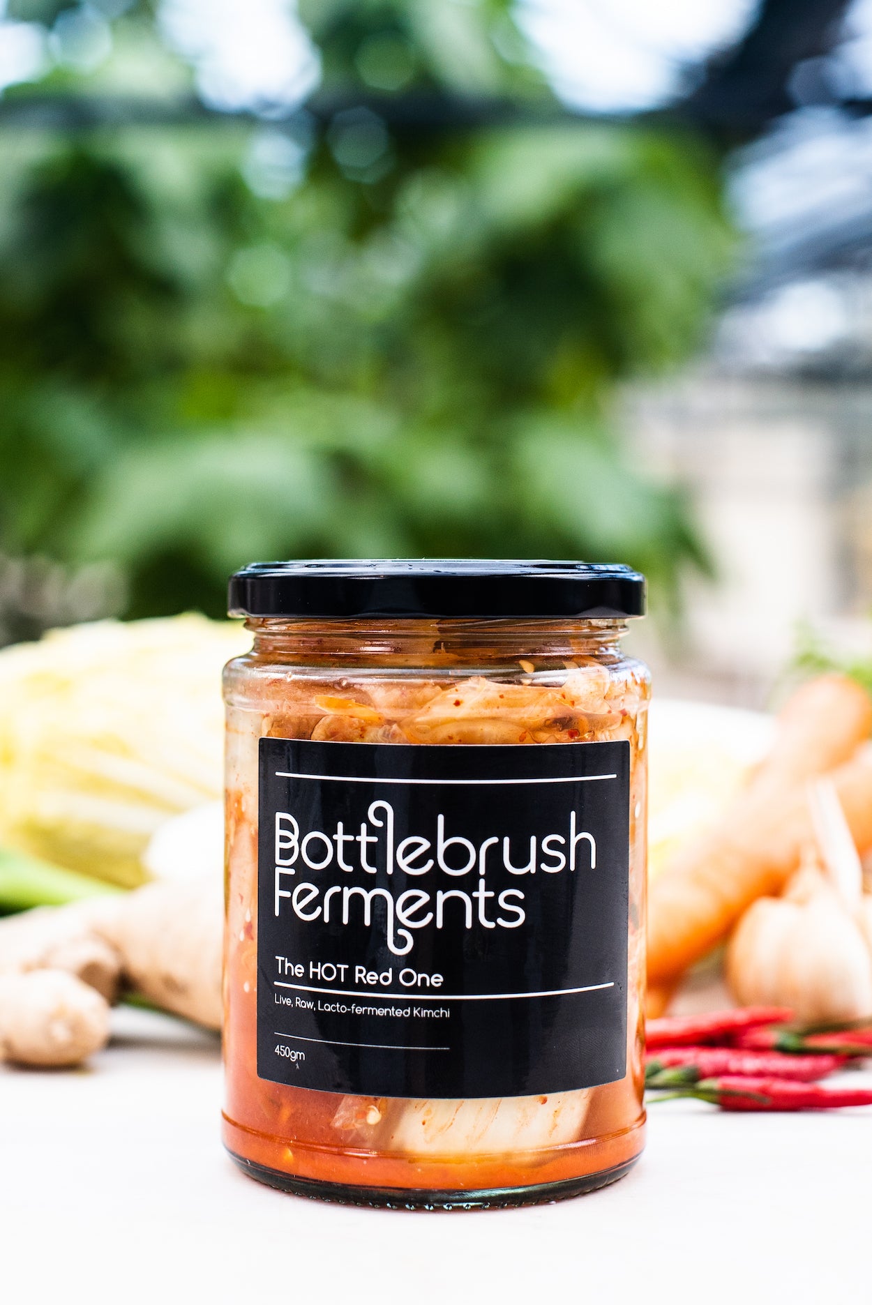Chinese Cabbage 55%, Daikon Radish/ Mooli 17%, Carrot 12%, root ginger 5%, Spring onion 3%, Gochugaru (Korean red pepper powder) 2.5%, pink Himalayan salt 2.5% red chilli 2%, fresh garlic 1%