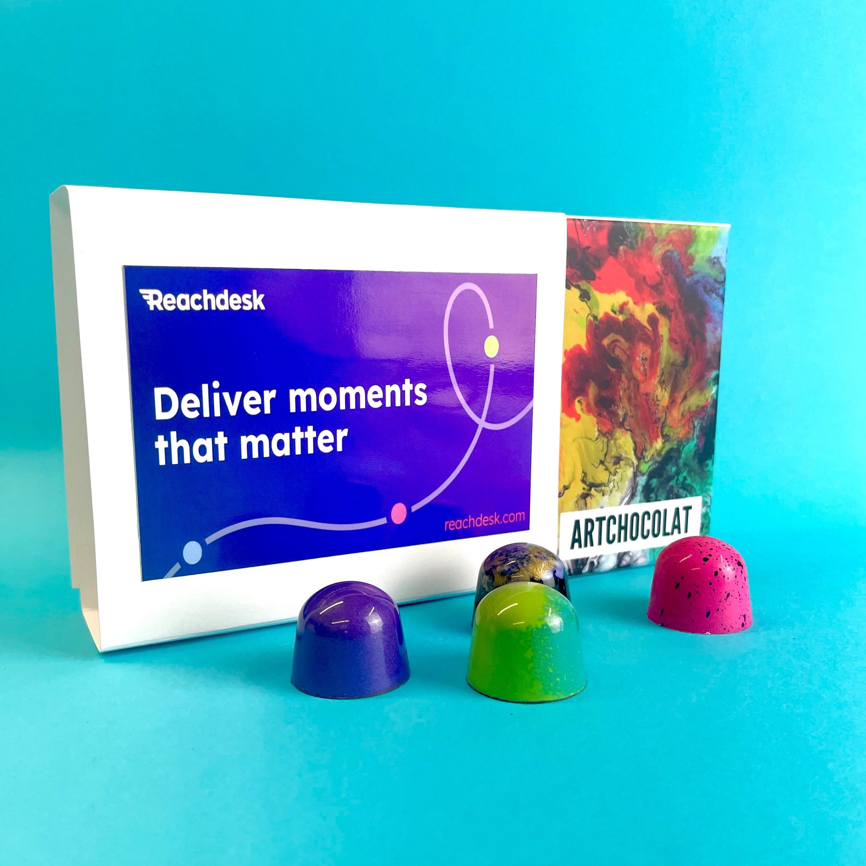 Presented in our beautiful box, finished with your artwork, a selection of our caramel chocolates. Handcrafted in our kitchen from start to finish, using the finest ingredients.