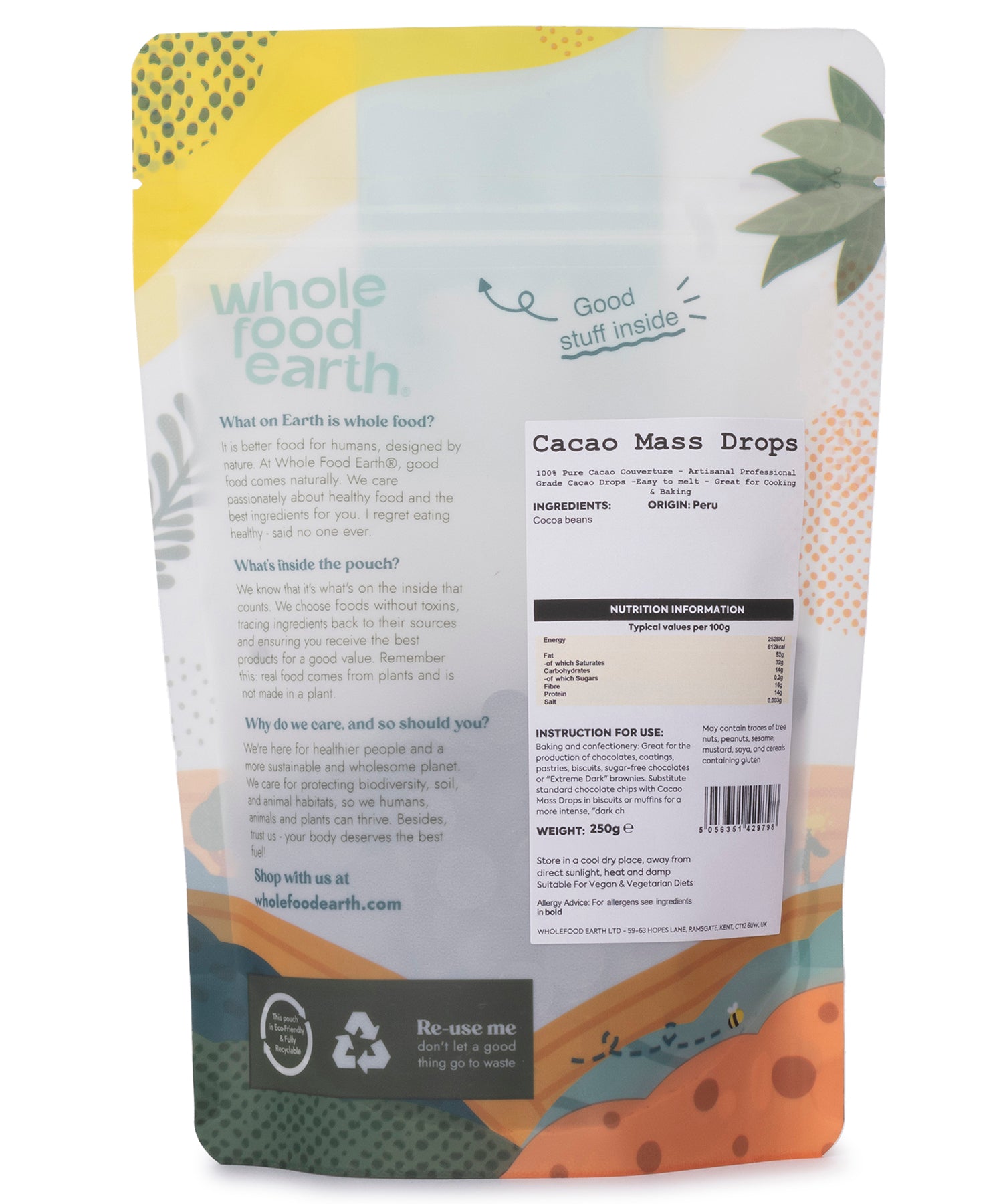 Pure cacao mass in convenient drop form, perfect for melting into desserts, hot chocolate, or baking projects. These drops deliver authentic chocolate flavour without added sugar or unnecessary ingredients.