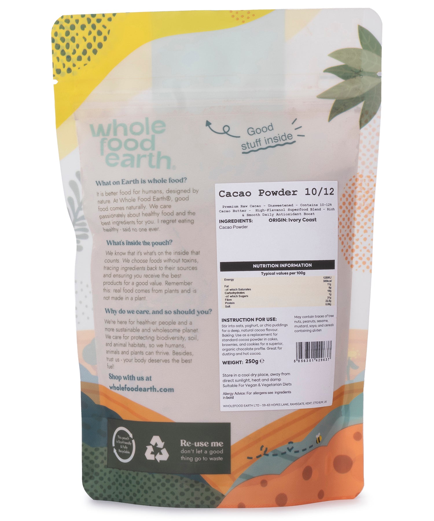 Premium cacao powder crafted from high-quality Ivory Coast beans, delivering rich chocolate flavour and natural nutrition. With 22.5g of protein per 100g, this pure 100% cacao powder is perfect for smoothies, baking, hot chocolate, and nutritious recipes. Naturally vegan and vegetarian friendly, it's a versatile ingredient for health-conscious cooking and indulgent treats alike.