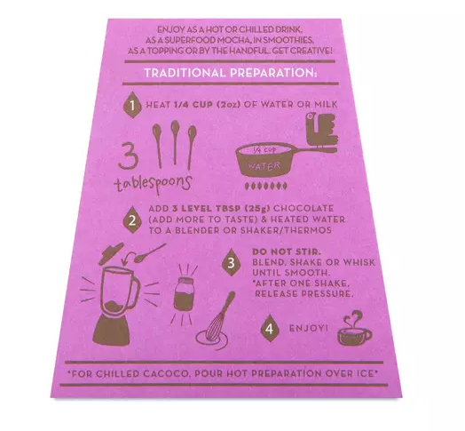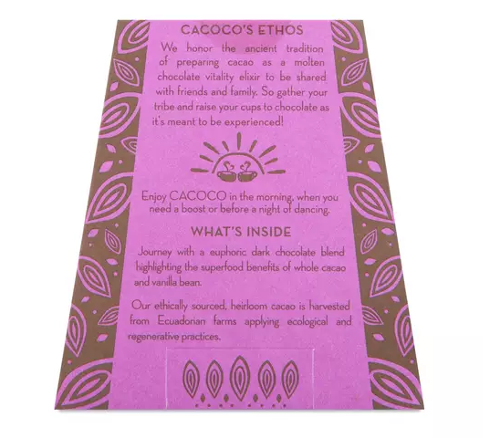 Journey with a euphoric dark chocolate blend highlighting the superfood benefits of whole cacao and vanilla bean. Cacoco’s ethically sourced, heirloom cacao is harvested from Ecuadorian farms applying ecological and regenerative practices. Enjoy as a hot or chilled drink, as a superfood mocha, in smoothies, as a topping or by the handful. Get creative! Ingredients Cacao*, Coconut Sugar*, Cacao Bu...