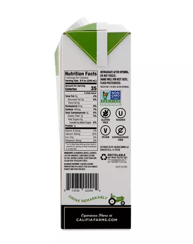 Califia Farms’ beloved Barista Blend Almondmilk is now available in an Unsweetened variety. They specially formulated this sugar-free Almondmilk for baristas to easily create full-bodied foam, pour better latte art (better stretching), and stay dairy-free without the sacrifice. Ingredients Almondmilk (Water, Almonds), Calcium Carbonate, Sunflower Lecithin, Sea Salt, Natural Flavors, Locust Bean G...