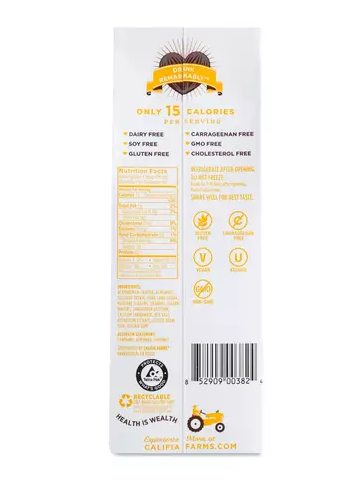 Califia Farms’ dairy-free hazelnut creamer will instantly take your morning cup of coffee from blah to ahh! Just pour, swirl, and sip for a delicious kick-start to your day. Made with 100% natural almond cream, and free from dairy, soy, and carrageenans. Ingredients Almond milk (Water, Almonds), Coconut Cream, Pure Cane Sugar, Natural Flavors, Caramel (Sugar, Water), Sunflower Lecithin, Calcium C...