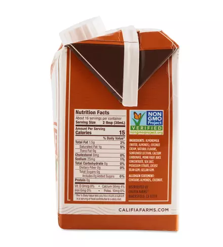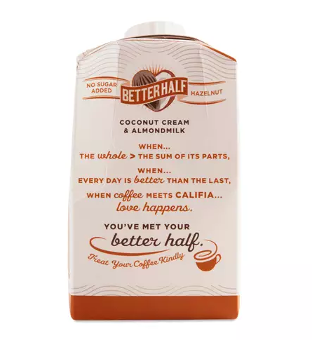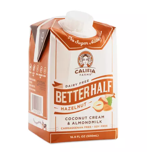 While almond milk tastes great in coffee, adding in some rich, thick coconut cream makes it taste and feel even more like half & half. Califia Farms Better Half creamer is a dairy- and soy-free substitute with just 20 calories per serving and great hazelnut taste. It’s also shelf-stable so you can stock up and take it with you to go, too. Ingredients Almondmilk (Water, Almonds), Coconut Cream, Na...