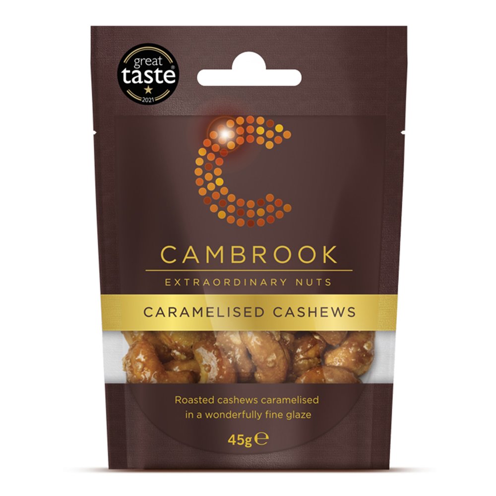 Caramelised Cashews 45g. Roasted cashews expertly caramelised in traditional copper pans to give a fine caramel glaze with a sprinkling of sesame seeds and sea salt. A great snack for any time of day