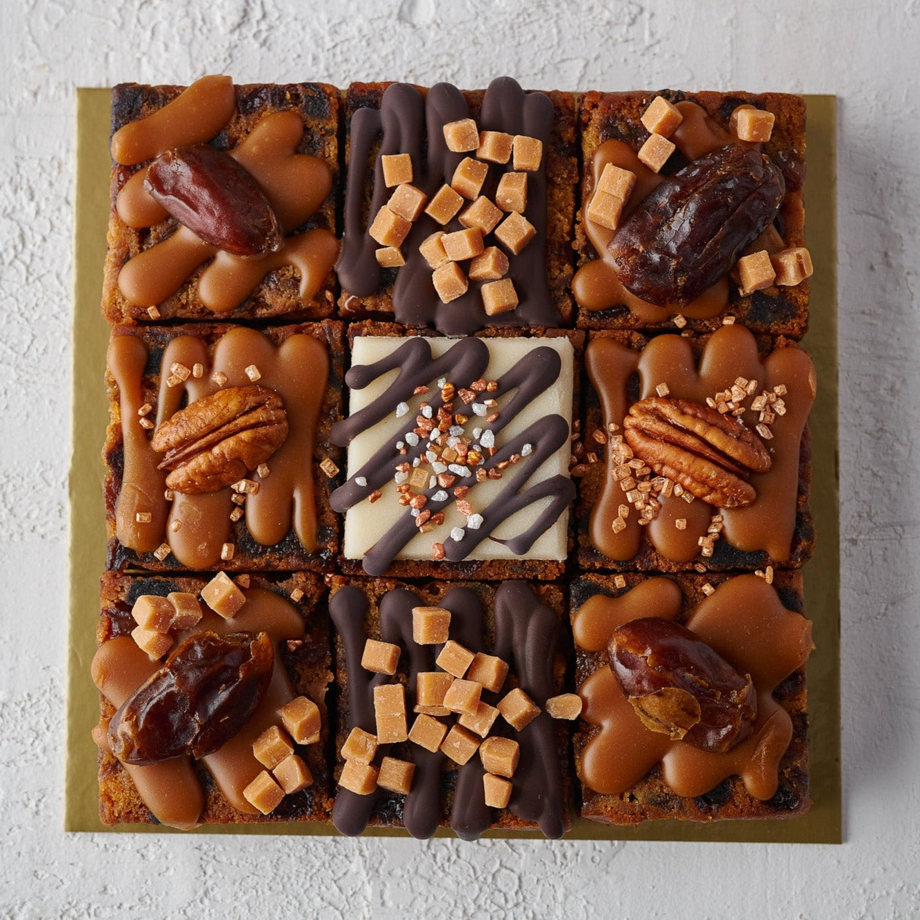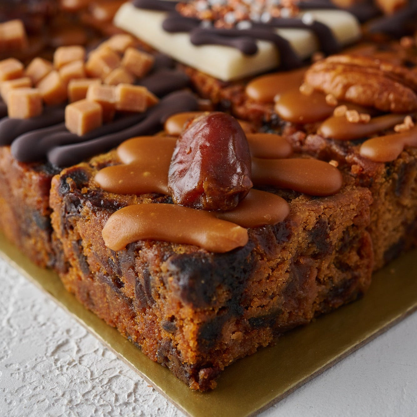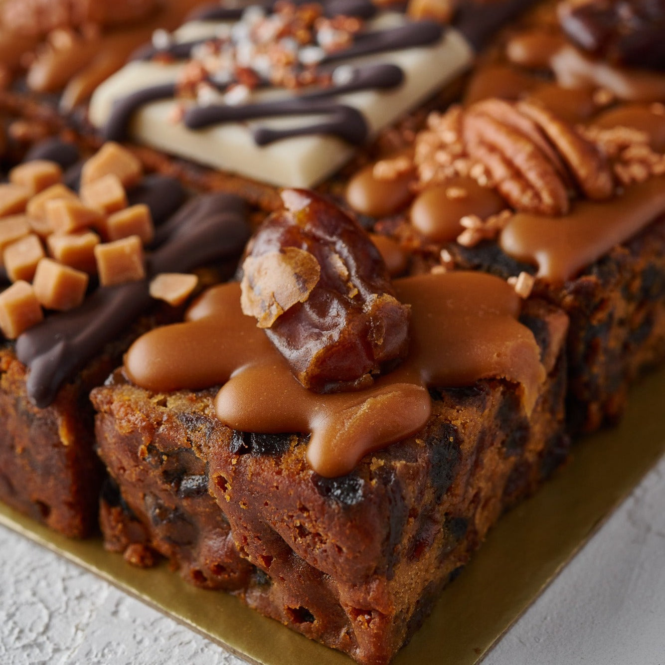 Indulge in the exquisite flavors of our Salted Caramel Date Fruit Cake Gift Box, a perfect blend of tradition and modernity. This decadent fruit cake features nine generous pieces of moist, handmade fruit cake infused with rich salted caramel and succulent dates. Each slice is beautifully adorned with luxurious caramel drizzles, plump dates, premium Belgian chocolate, and luscious fudge pieces, creating a harmonious balance of sweet and savory notes that delight the palate.