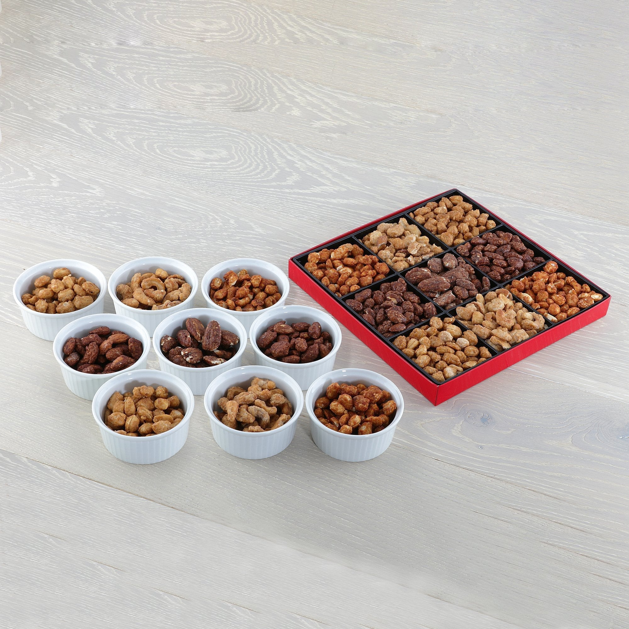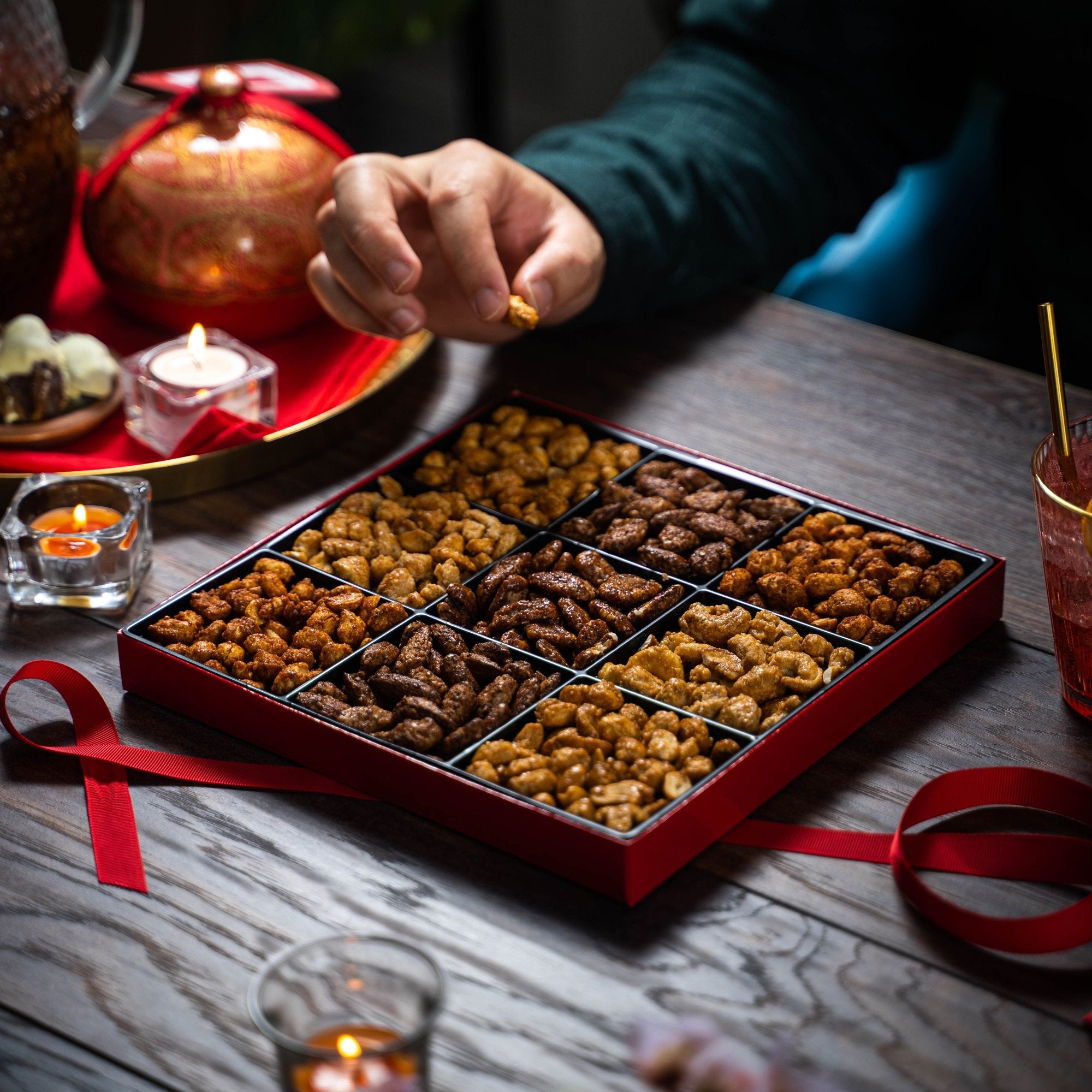 A sumptuous selection of roasted and caramelised nuts, presented in our signature selection gift box. Delicious pecans are enveloped in a molten caramel, creating a crisp caramel shell; whole cashews are gently honey roasted to a perfect golden brown; lightly salted cashews are generously glazed in natural honey with an added hint of real sugar, as well as whole almonds enrobed with real honey and then hand-roasted in small batches making them rich in flavour and plump in texture. Finally we’ve added deliciously roasted peanuts, sprinkling one section with chilli powder and another with salt to complete this luxurious nutty gift set that combines sweet, salty and spicy in one hit, to tantalise taste buds.