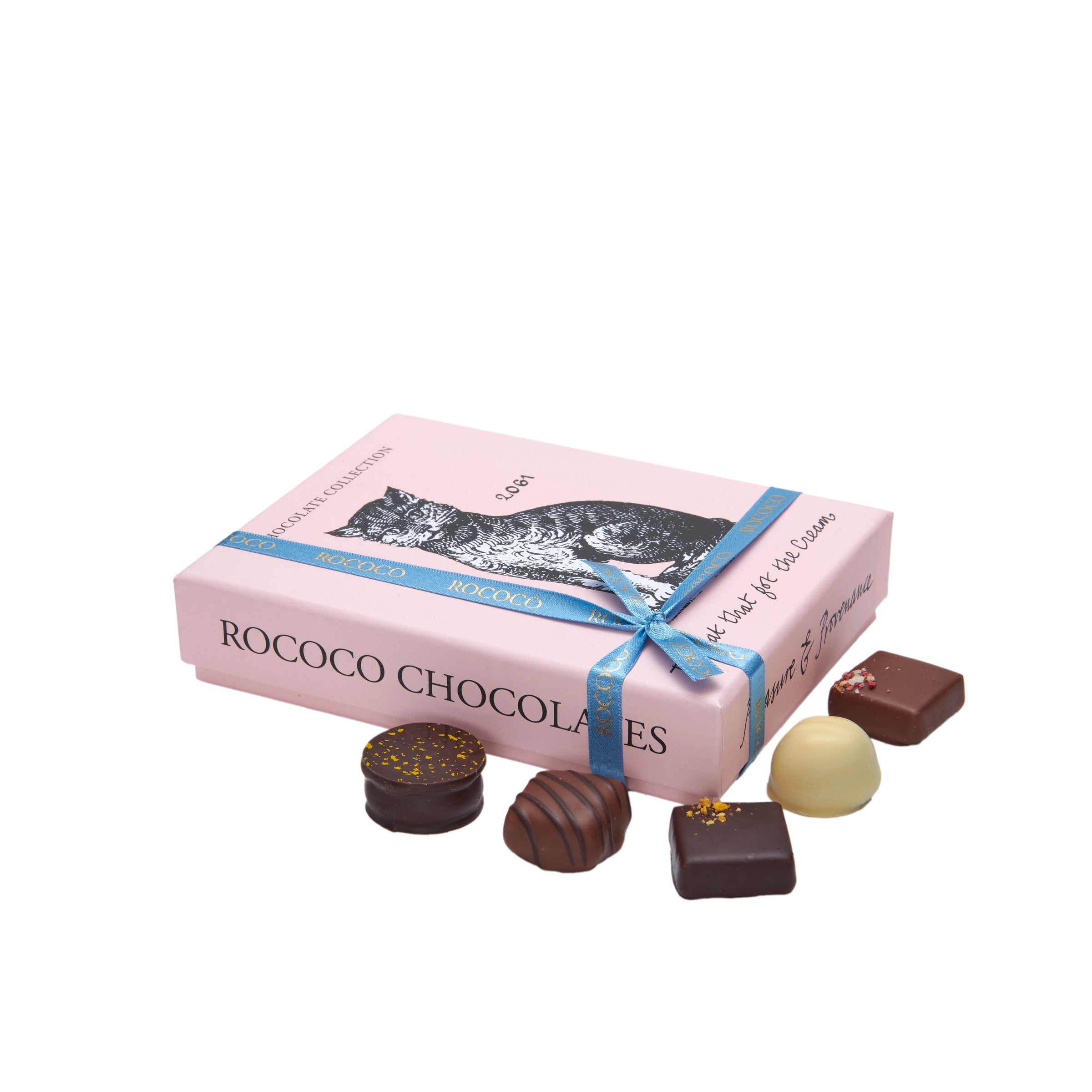 The perfect indulgence for cat lovers, our Cat That Got The Cream Chocolate Truffles Box is a delightful collection of 12 exquisite ganaches and pralines. Each piece is a unique cat-shaped chocolate creation, meticulously handcrafted to bring joy to both chocolate enthusiasts and feline admirers alike. These cat chocolates for humans are enveloped in a rich, premium layer of chocolate, ensuring that the distinct and sophisticated flavours shine through with every bite. Whether you're searching for a charming gift or a special treat for yourself, this box of chocolate cats promises a memorable tasting experience. Presented in an elegant Rococo gift box, it’s an ideal choice for birthdays, anniversaries, holidays, or simply to show someone you care. Discover the artistry and passion that goes into each chocolate cat, making this box a standout option in the world of gourmet chocolate gifts.