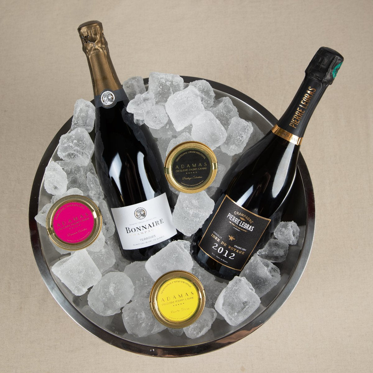 The chalky characteristic of Bonnaire Terroirs Grand Cru Blanc de Blancs prepares the palate beautifully for our creamy Adamas Award-Winning caviar. The mineral notes of the champagne contrast and complement the pure, delicate flavour of the caviar, enhancing its wonderfully creamy texture and unique aromatic finale. Together, they create an unparalleled gastronomic experience, a true delight for the taste buds.