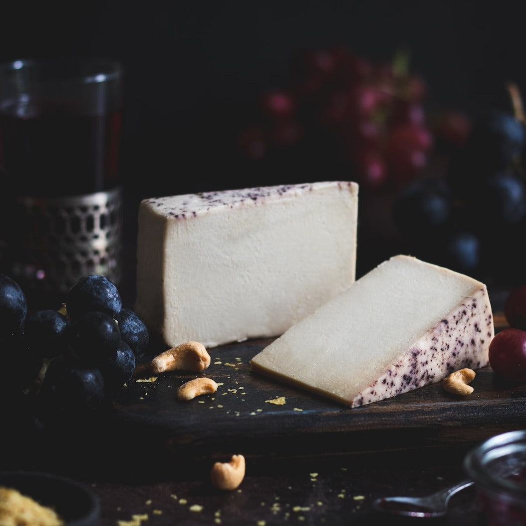 Boasting a strong, extra mature flavour, this umami delicacy gives you hints of salty, sweet, sour, and bitter all underneath a crust of light fruity, earthy, açaí super-berry powder. The full flavour profile of this delicious vegan cheese will leave you wondering, “Is there any dairy?”