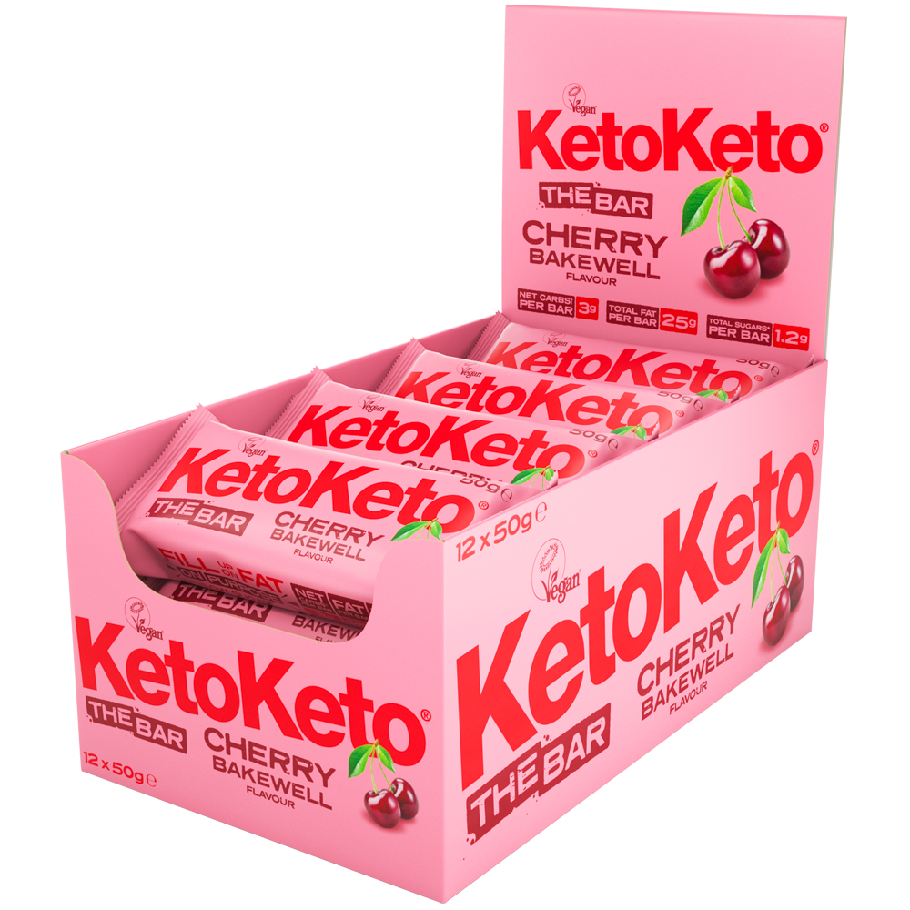 Cherry Bakewell Keto Bar with only 3g Net Carbs and full of healthy fats. Perfect for snacking, meal replacement or as part of a Keto dessert recipe. Certified Vegan