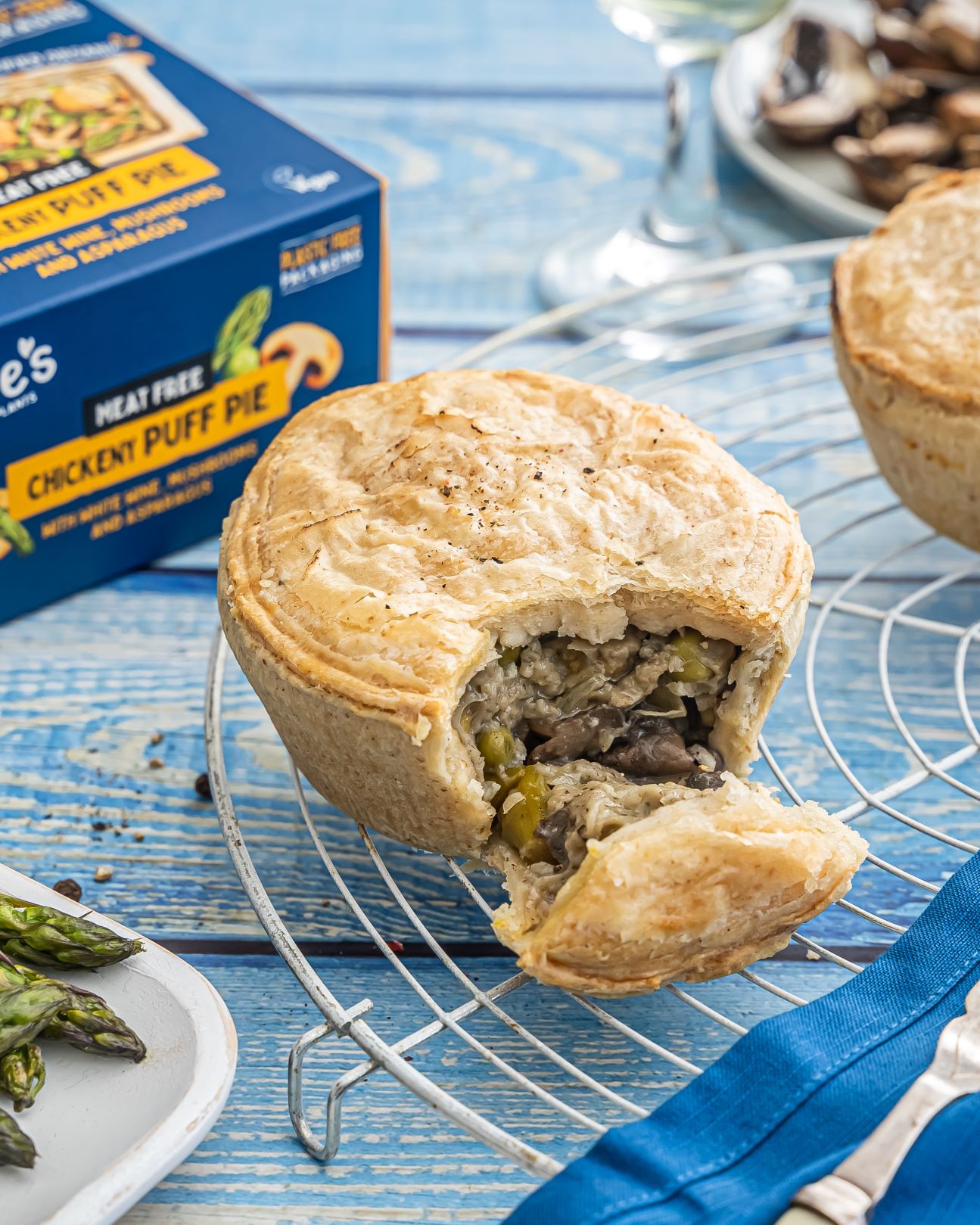 Rough puff pastry top with a shortcrust base, filled with seitan, mushrooms, asparagus and peas in a creamy white wine sauce. Our home made herby seitan packs a meat-free punch in this spring vegetable medley. Serve with baked potatoes for pub-style grub at home.