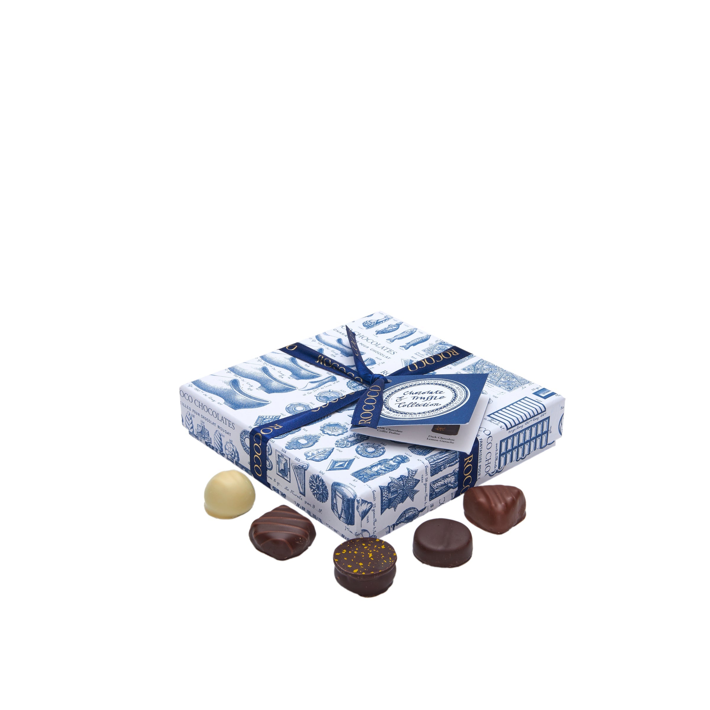 Our Rococo Chocolate and Truffle Collection small box includes an array of 16 meticulously selected truffles and chocolates, featuring: