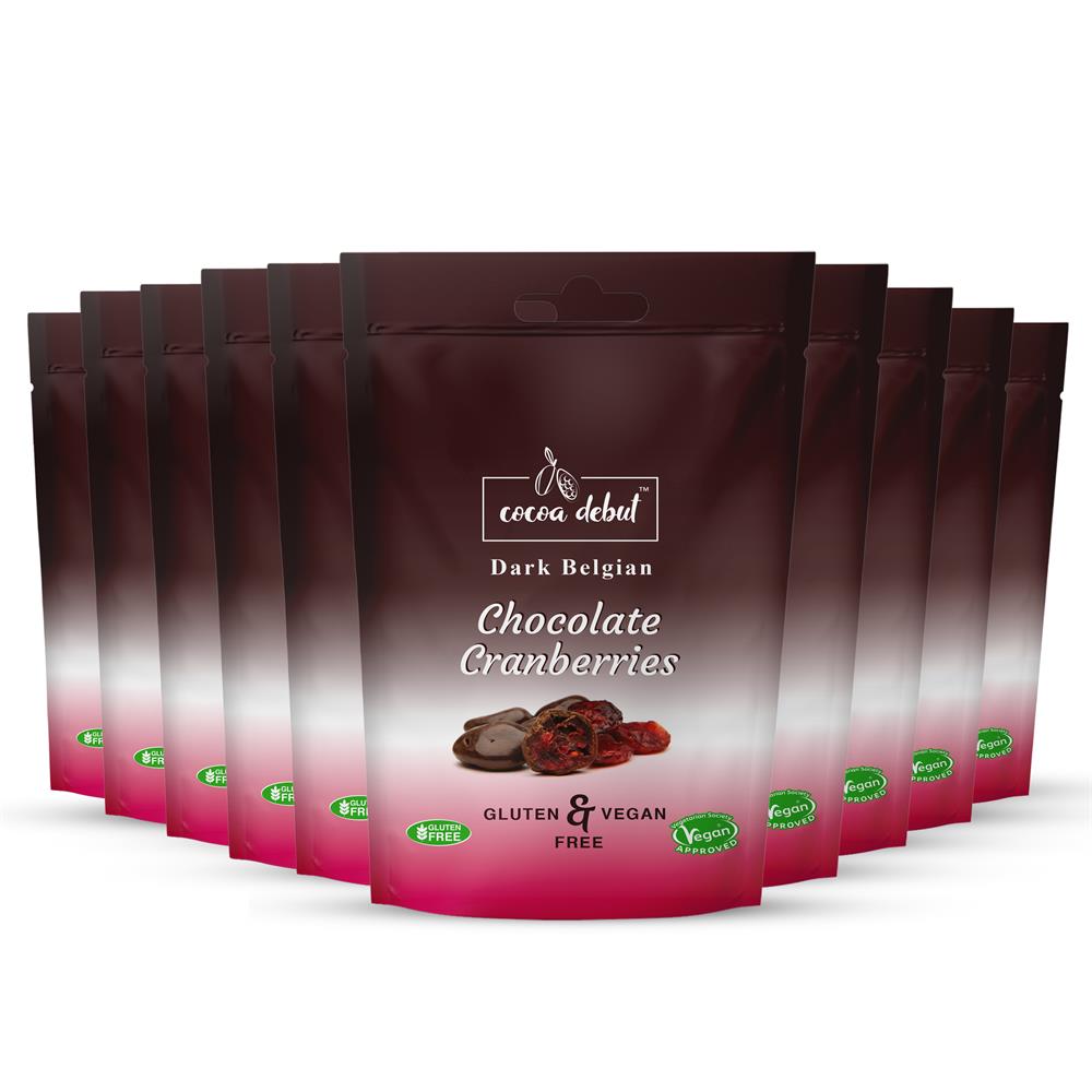 Juicy Cranberries Coated in Smooth Dark Belgian Chocolate, Vegan & Gluten Free - 45g The perfect combination of sweet and tangy, chewy and crunchy. Our Belgian chocolate-coated cranberries will give your tastebuds a tingle and your body a health boost.
