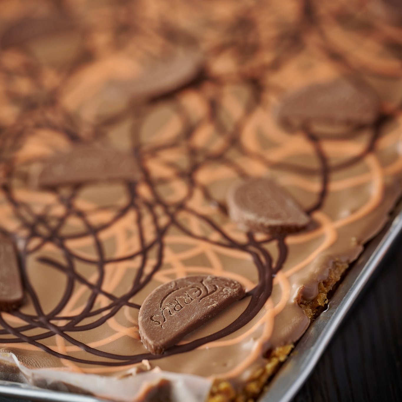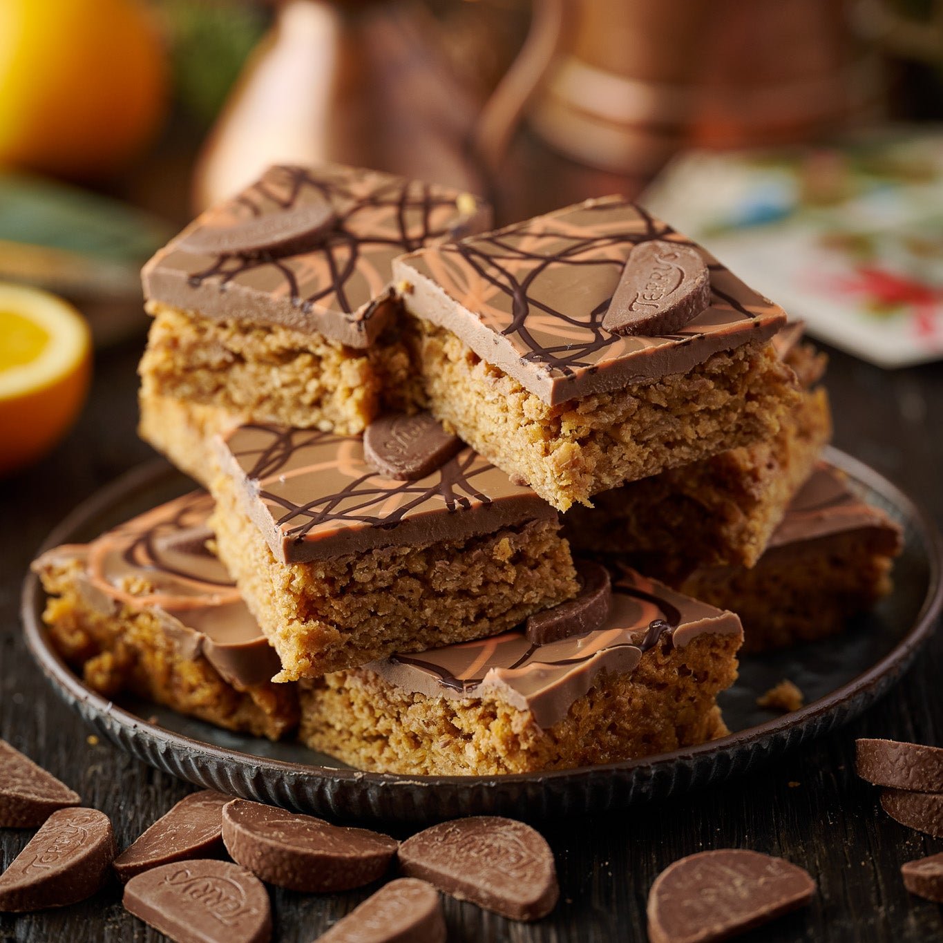 Enjoy a twist on a classic treat with our Chocolate Orange Flapjack. This flapjack is baked with a hint of zesty orange and topped with a smooth layer of milk chocolate, drizzles of orange and dark chocolate, and finished with pieces of Terry’s Chocolate Orange.