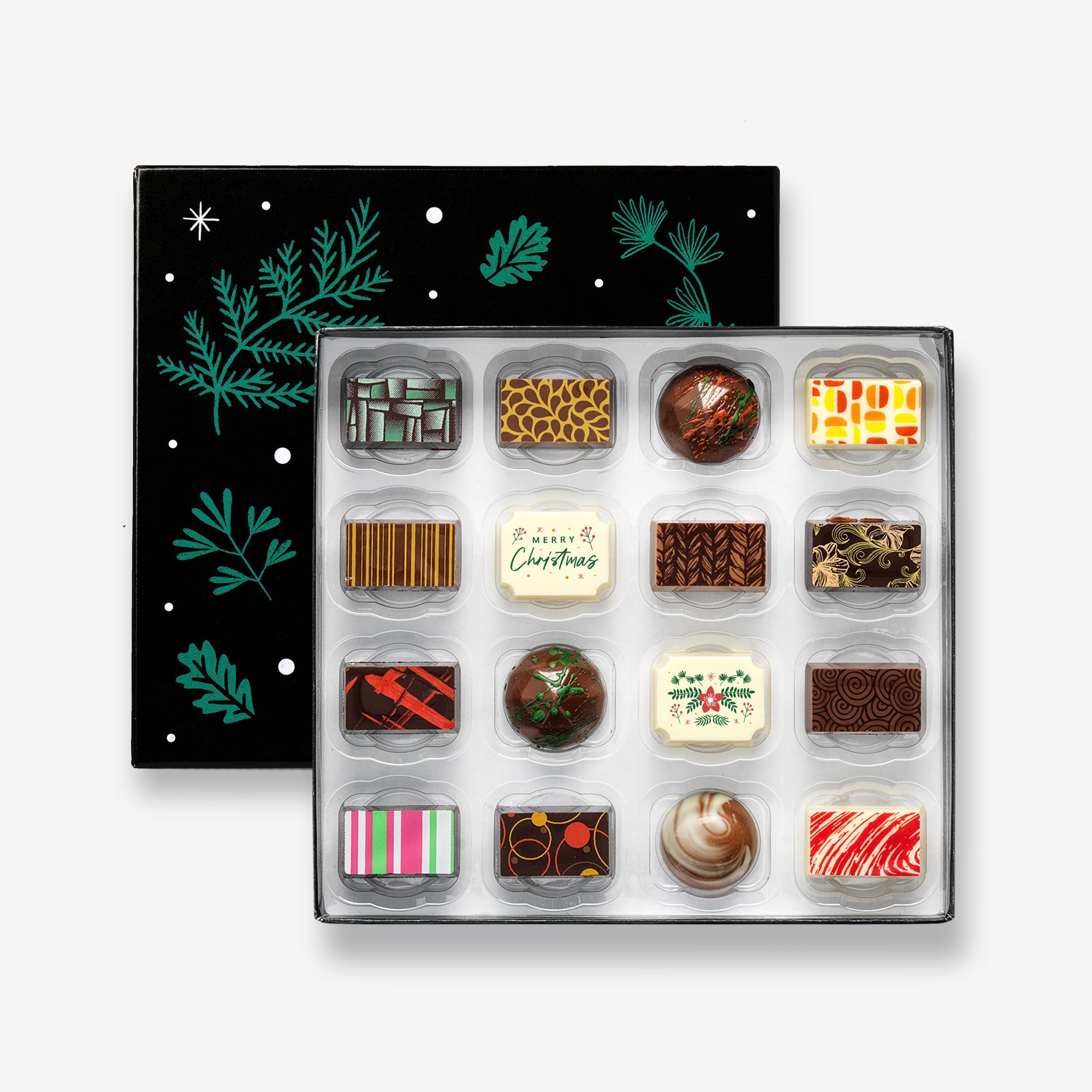 A luxury selection box of 16 filled artisan chocolates, featuring two special 'Christmas' themed chocolates. Made with natural ingredients and hand-decorated with cocoa butter.