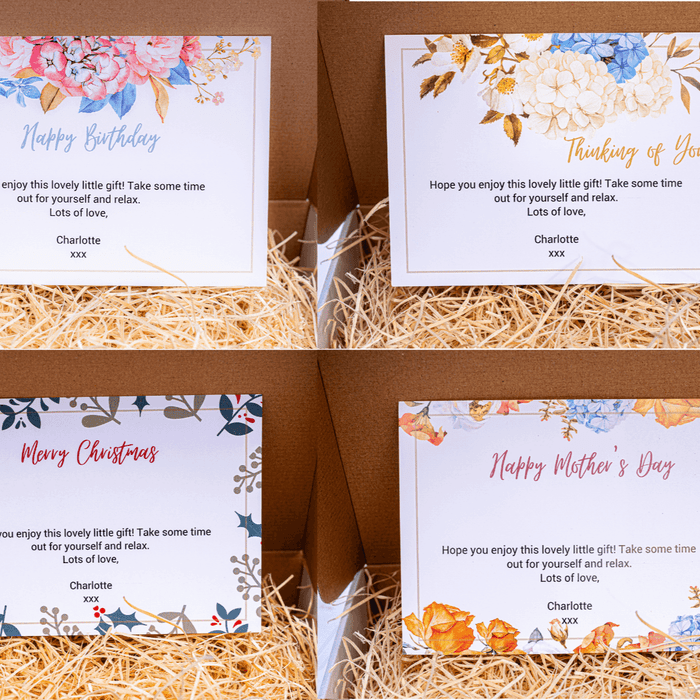 Want to spoil a loved one and gift them the perfect pamper present? We have you covered, just choose your preferred card design, provide us with your personalised message at checkout and we will print it and include it in your gift box.