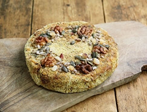 Organic nut roast with chestnuts, almonds, brazils, walnuts, fresh vegetables, seeds and herbs. All packed inside a crispy polenta crust.