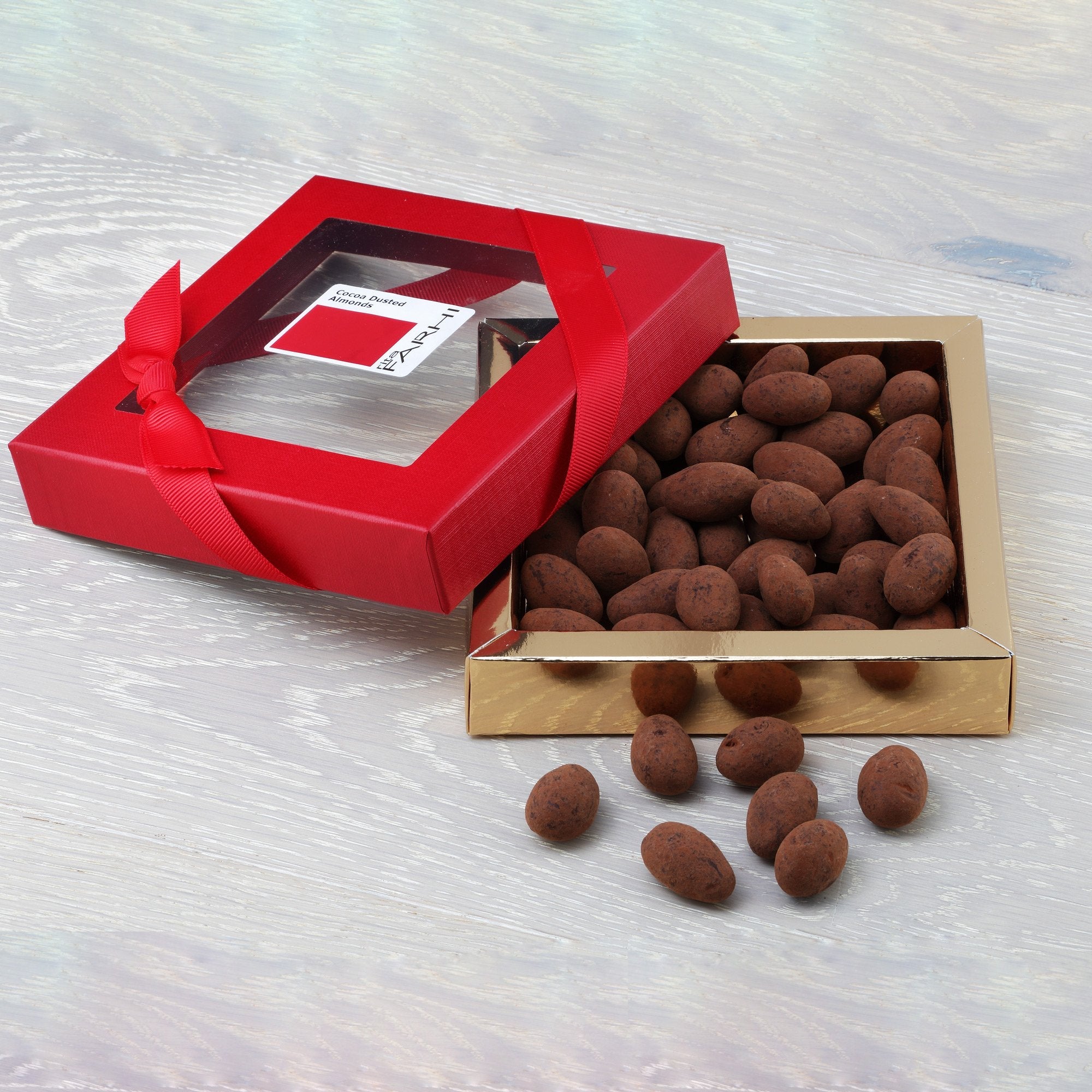 Utterly glorious, plump, Californian, sun-ripened almonds, are slowly air roasted to bring out their maximum flavour before being covered in lashings of silky smooth milk chocolate and tossed in a light coating of cocoa, creating the perfect after dinner, or mid-morning treat. A wonderfully indulgent treat, this attractive bow sealed box is great to share with friends, family and colleagues. A brilliant birthday or thank you gift for nut and chocolate enthusiasts.