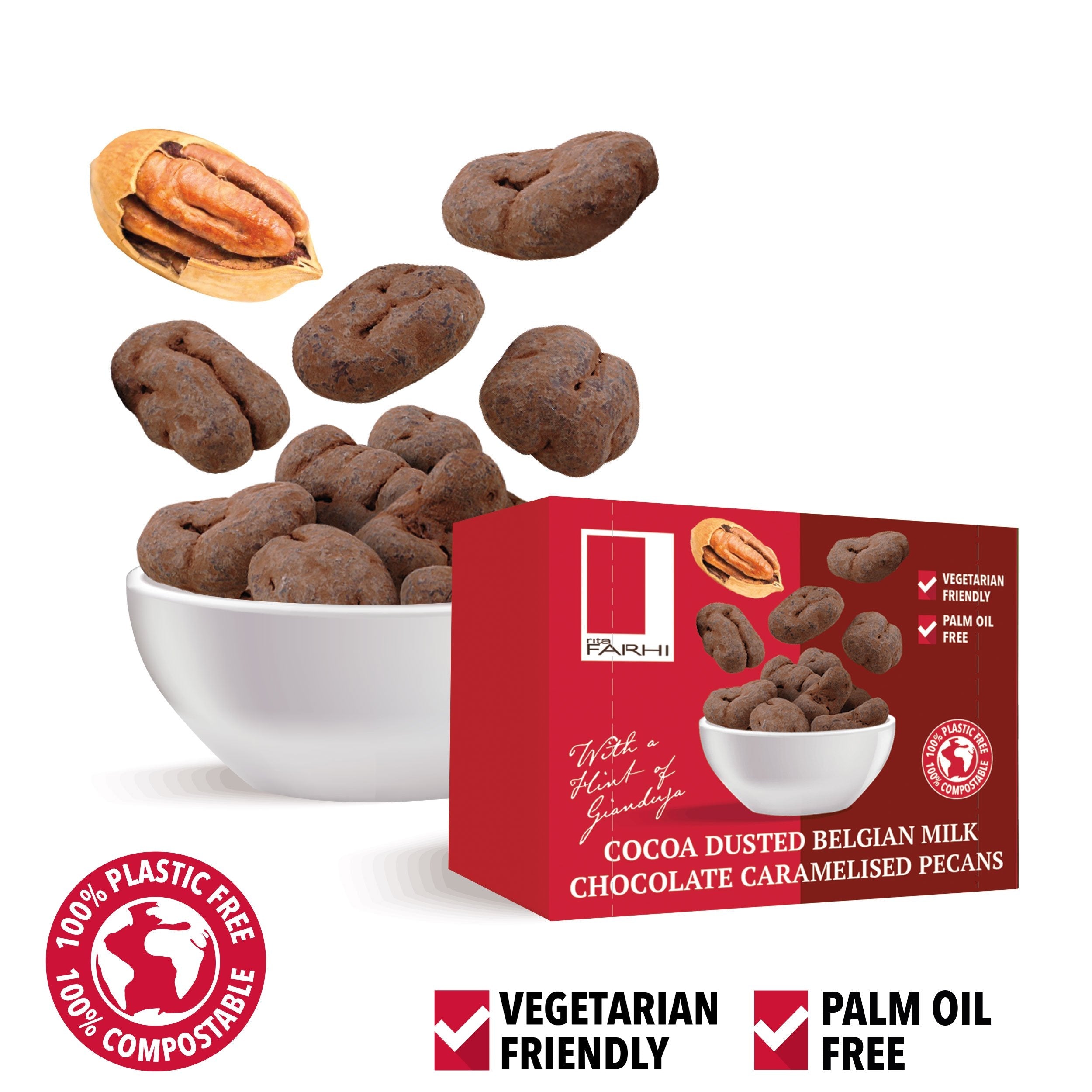 COCOA DUSTED MILK CHOCOLATE PECANS: Milk Chocolate (65%)(Sugar, Full Milk Powder, Cocoa Butter, Cocoa Mass, Emulsifier: Soya Lecithin, Flavouring), Pecans (25%), Gianduja (10%)(Sugar, Hazelnut, Cocoa Butter, Whole Milk Powder, Cocoa Mass, Emulsifier: Soya Lecithin), Cocoa Powder.